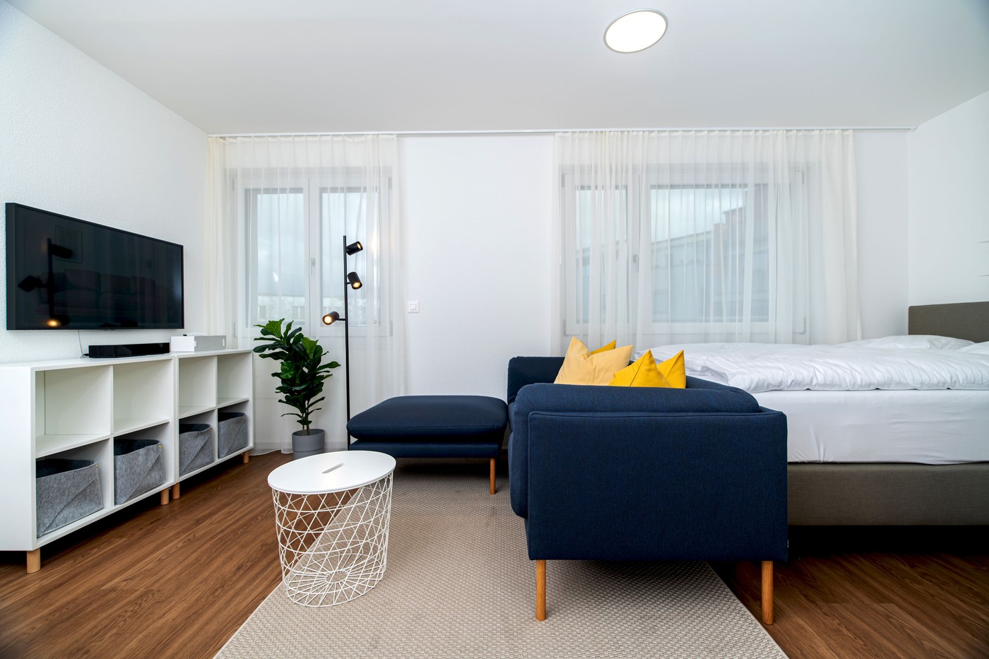 What about the building? It was renovated in 2021 explicitly for furnished apartments. This means no compromises between different residents, but a tailor-made concept, developed for the needs of the guests of Service Apartments. The building has 10x 1.5 room apartments, 5x 2.5 room apartments with a balcony and 1x 3.5 room apartments on the top floor with a panoramic view over the city of Basel. Our Business Apartments are fully furnished and have a high-speed internet connection so that you can work efficiently from your serviced apartment. “Fully furnished” solutions mean finding everything you need in a flat, from the kettle and iron kit to bed linen and towels. In addition to the basics, the Frame-TV should keep you entertained on rainy days. The TV subscription is also included, so all you have to do is choose a film. A good sound system should not be missing in your serviced apartment to get you fuelled up in the morning: our playlists will offer you groovy awakenings. All furnished apartments have large built-in closets. If you need additional storage space, we will be happy to provide you with storage rooms in the building. If you are travelling with your car, we will also be happy to look for a parking lot in the area. However, you should be able to reach all important districts of the city easily by public transport, even without a car, from our business apartments.