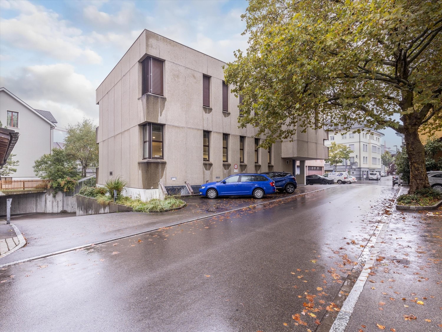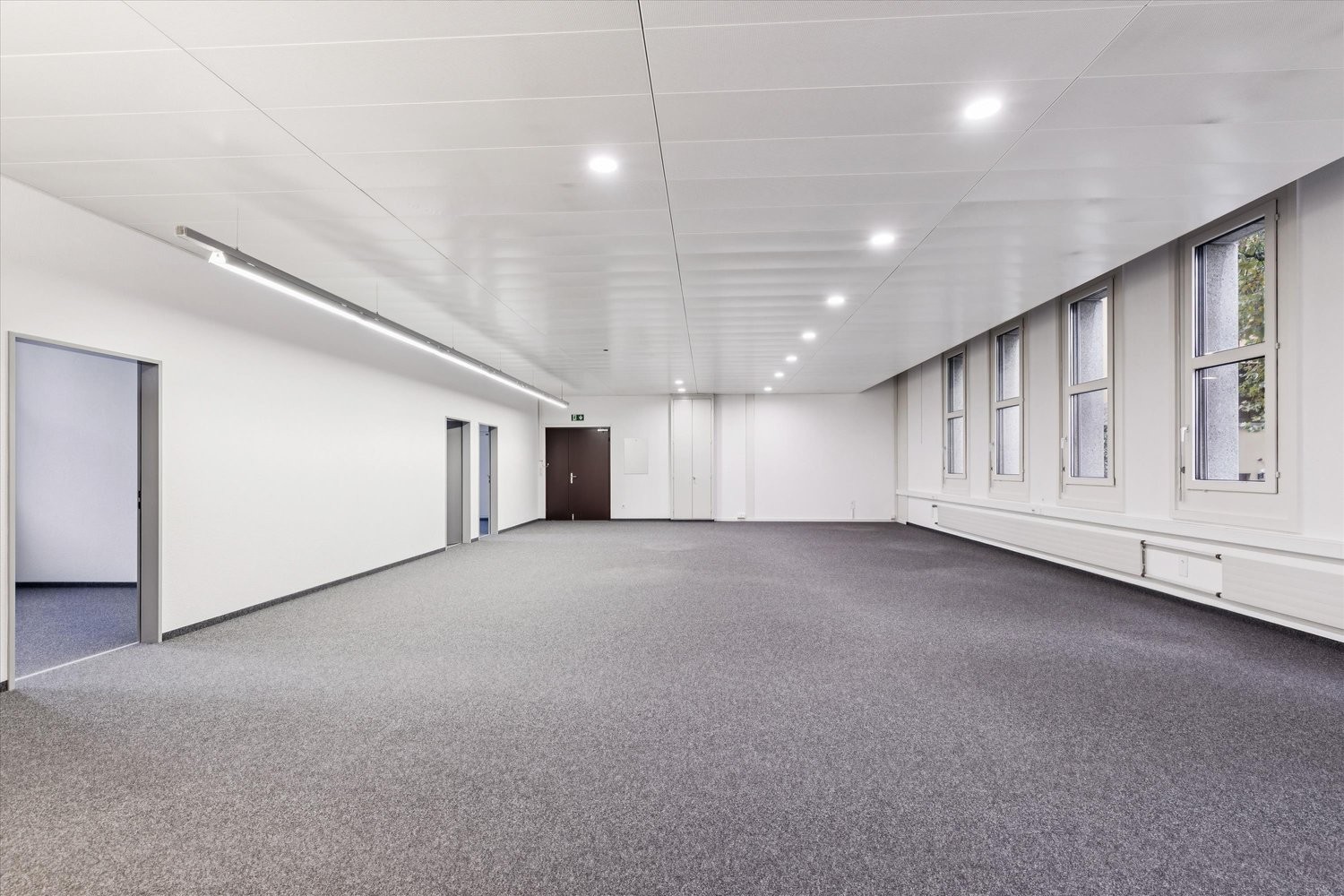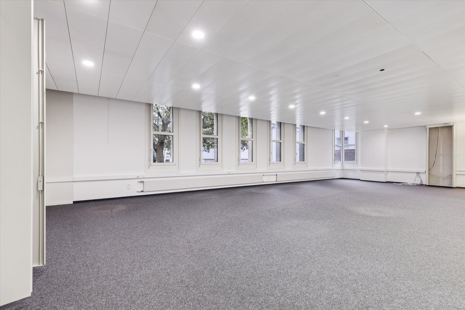 Die 175m² große Bürofläche im Erdgeschoss bietet eine durchdachte Raumaufteilung mit einem großen, offenen Arbeitsbereich sowie einem separaten kleinen Büro, ideal als Besprechungsraum, Einzelbüro oder Rückzugsort. Der Teppichboden sorgt für eine angenehme Arbeitsatmosphäre, während die vielen Fenster für natürliches Licht und ein freundliches Raumklima sorgen.