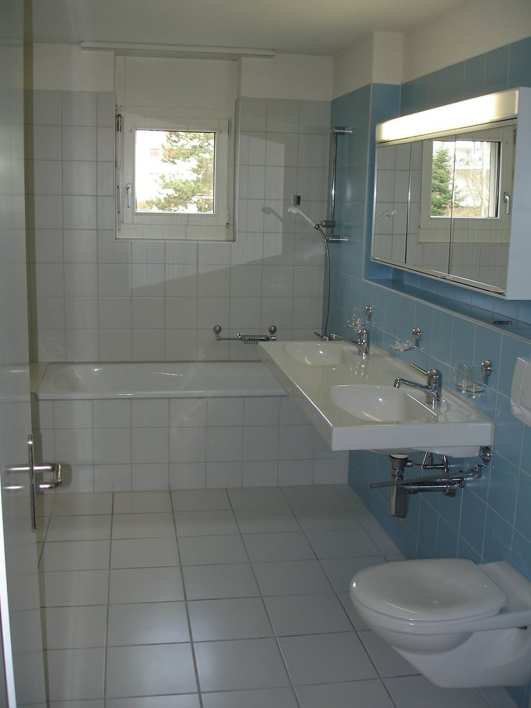 - Badezimmer mit WC, Lavabo, Spiegelschrank und Badewanne