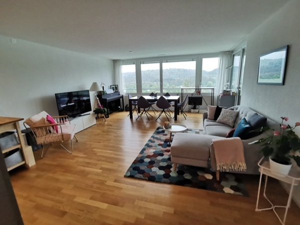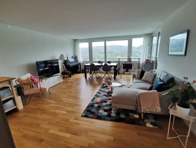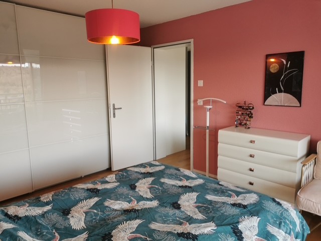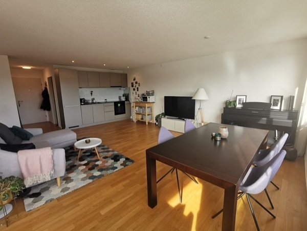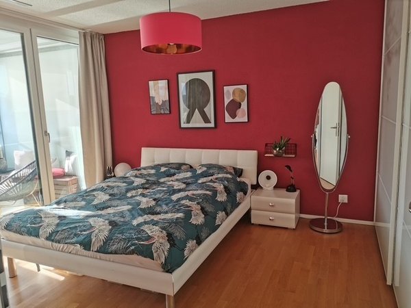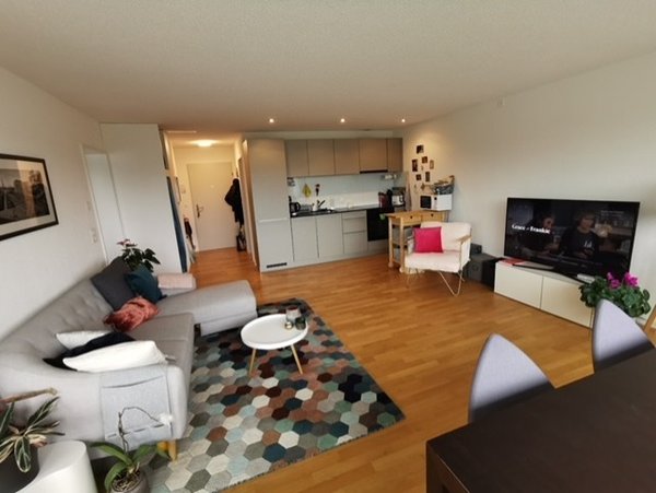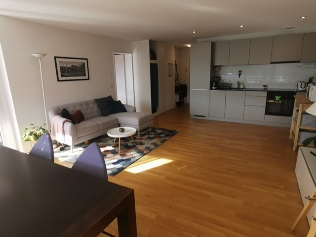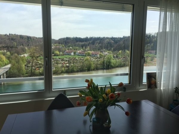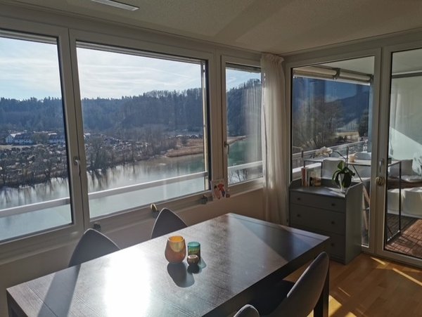The 2.5 rooms apartment measures 56 m2, is very bright and with a beautiful view on the river Aare! There is a terrasse, a big living room with an open kitchen, a bed room with a big bed (1.60 m) and wardrobe, and a bathroom with shower, washing machine and dryer. WiFi and TV.