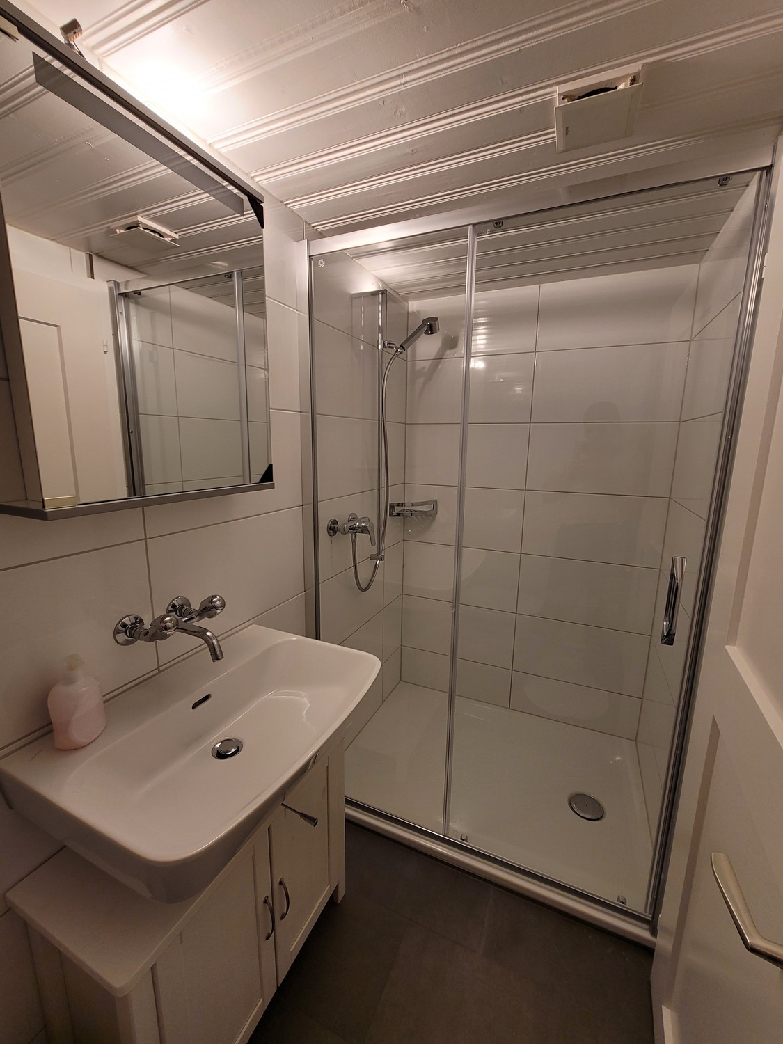 ✅ Stilvolles Badezimmer mit grosser Dusche, hellen Wandfliesen und pflegeleichtem Boden