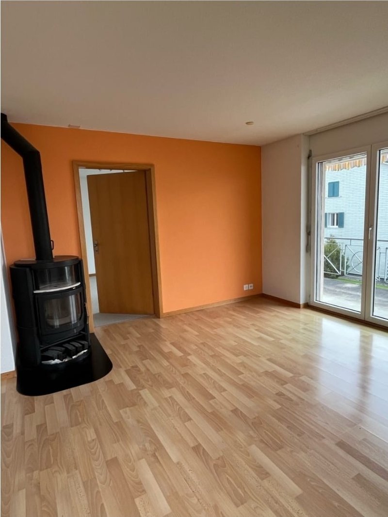 Die offene Ess- und Wohnküche bildet das Herzstück der Wohnung und überzeugt mit viel Tageslicht sowie einem gemütlichen Schwedenofen. Von hier aus besteht direkter Zugang zum Balkon, der sich über die gesamte Vorderseite des Hauses erstreckt.