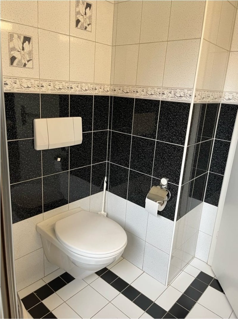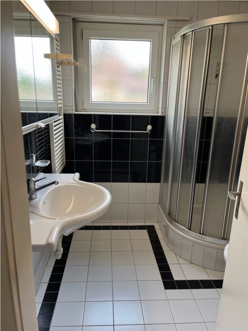Das Badezimmer ist mit Dusche, WC, Lavabo und Fenster ausgestattet.
