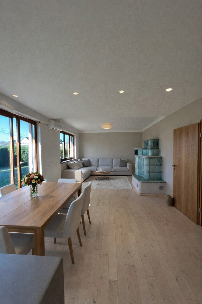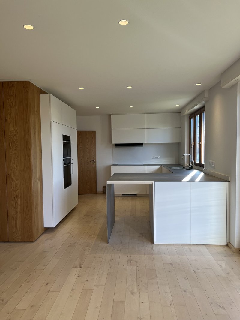 Im EG befindet sich eine grosse Küche mit neusten Geräten. Durch den offenen Wohnraum grenzt ein schön lichtdurchflutetes Wohnzimmer mit einem funktionsfähigen Kachelofen in dezentem Mintgrün an. Neben einem grossen Badezimmer mit Badewanne und Toilette befinden sich zwei weitere Zimmer auf dieser Etage.