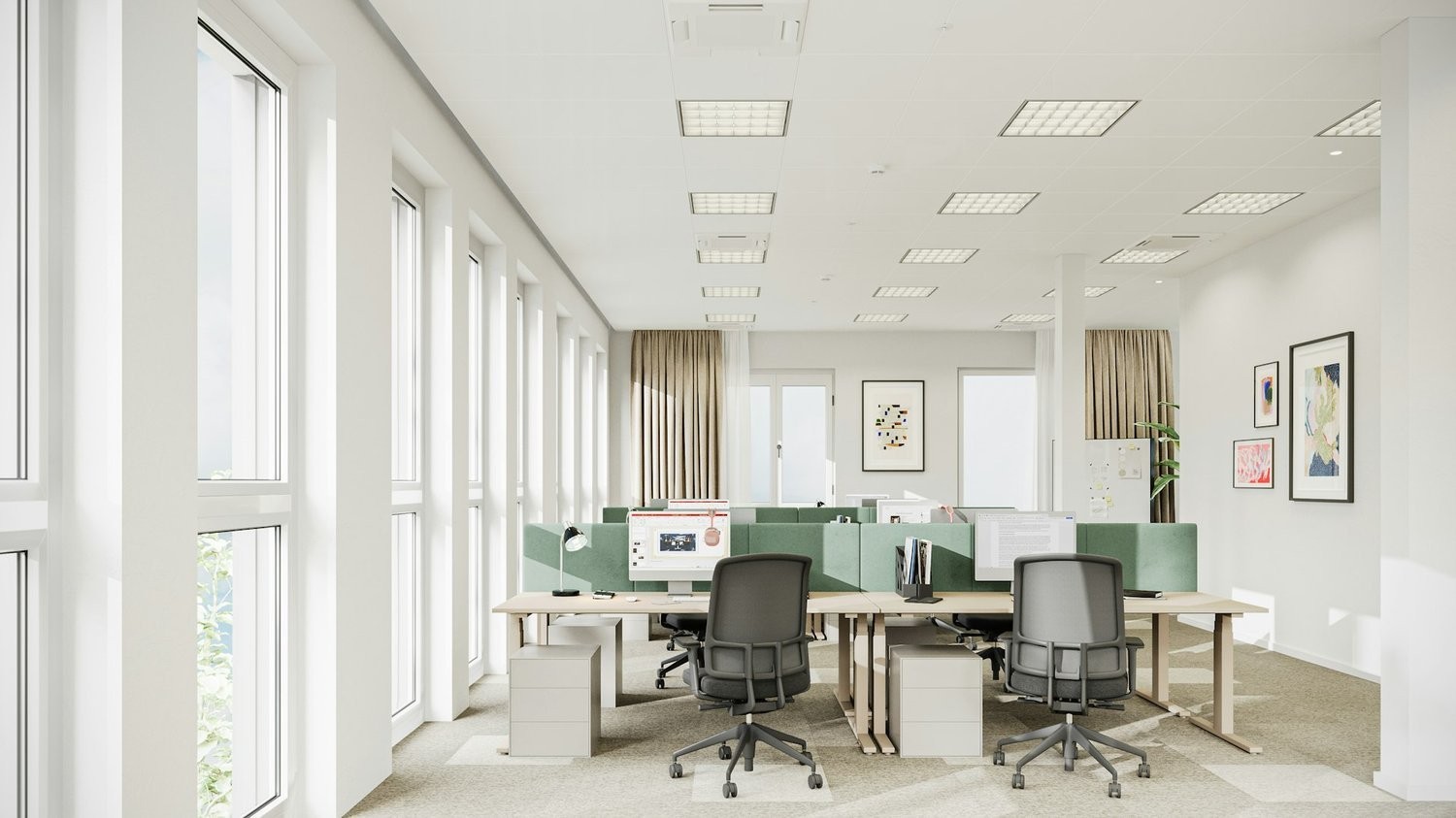 Grosse Fensterfronten für lichtdurchflutete Arbeitsbereiche
