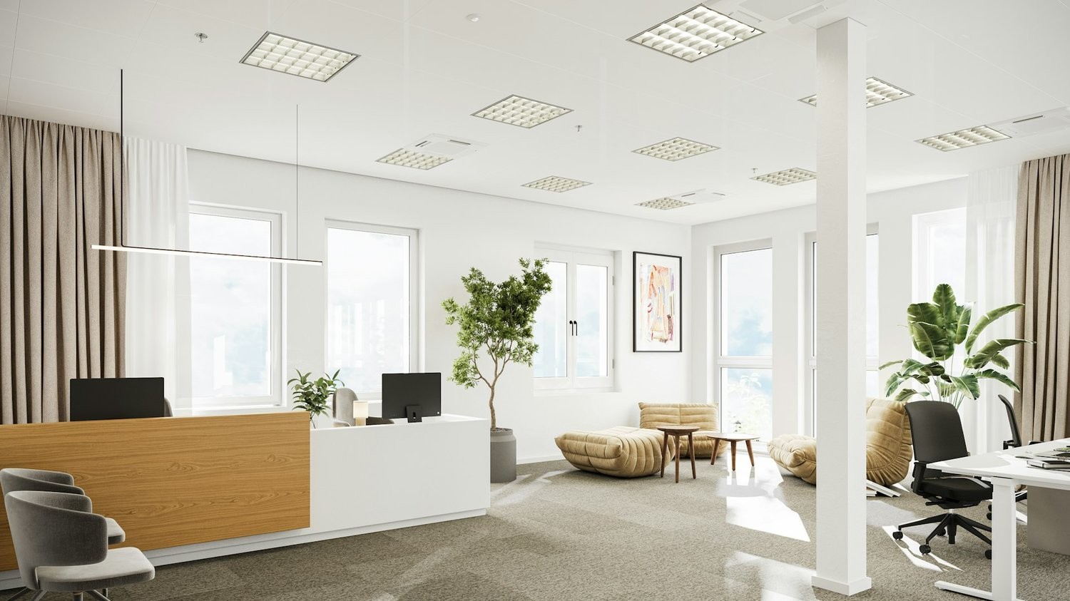 Grosse Fensterfronten für lichtdurchflutete Arbeitsbereiche