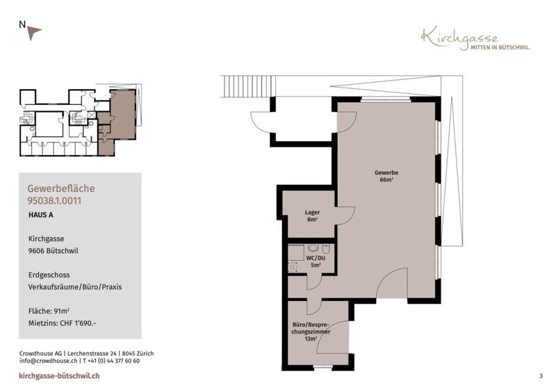 Im Erdgeschoss der Liegenschaft, mit total 19 Mietwohnungen, stehen 2 Gewerbeeinheiten, welche zur Strassenseite ausgerichtet sind (Schaufenster und Eingang zur Strassenseite) zur Vermietung bereit.