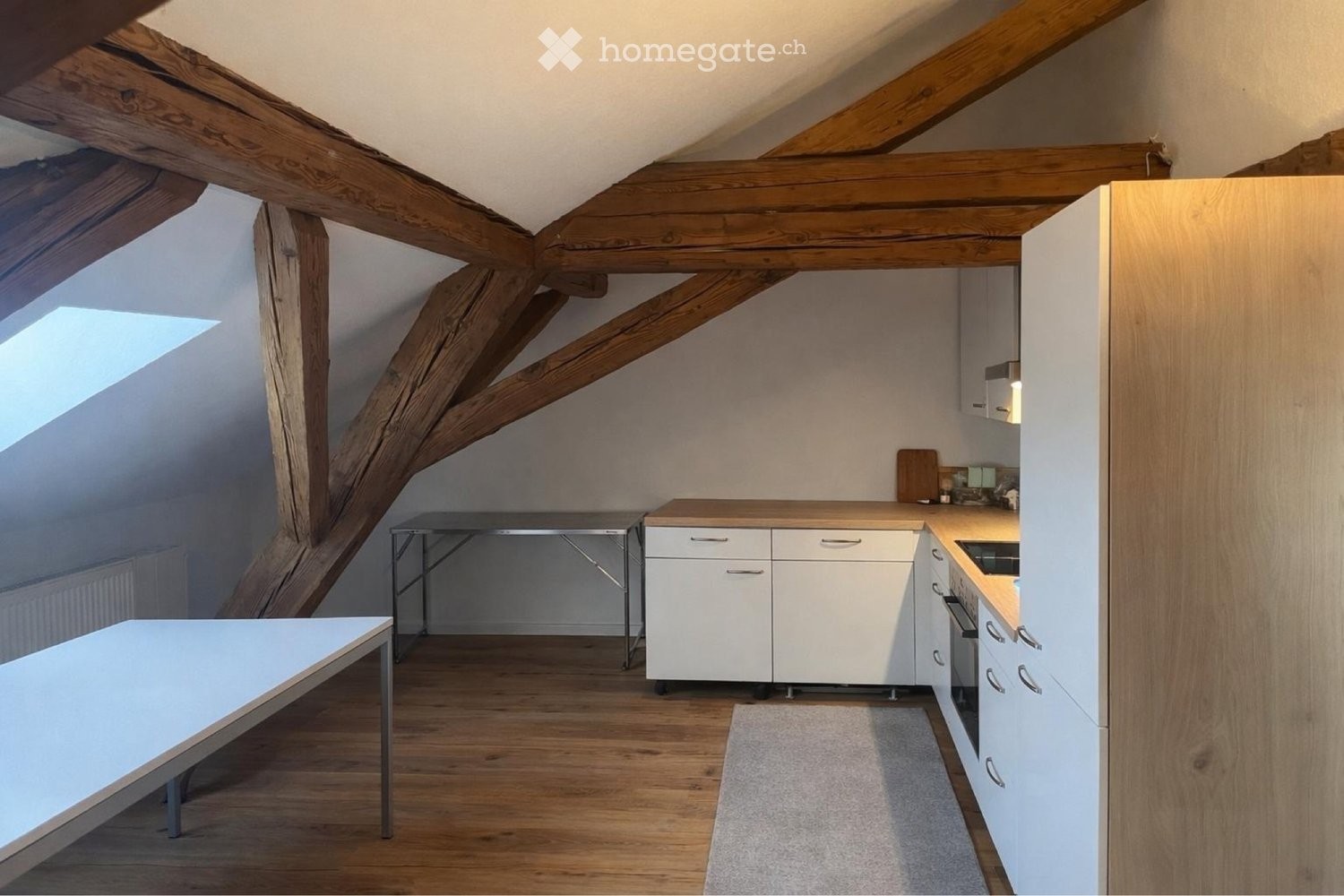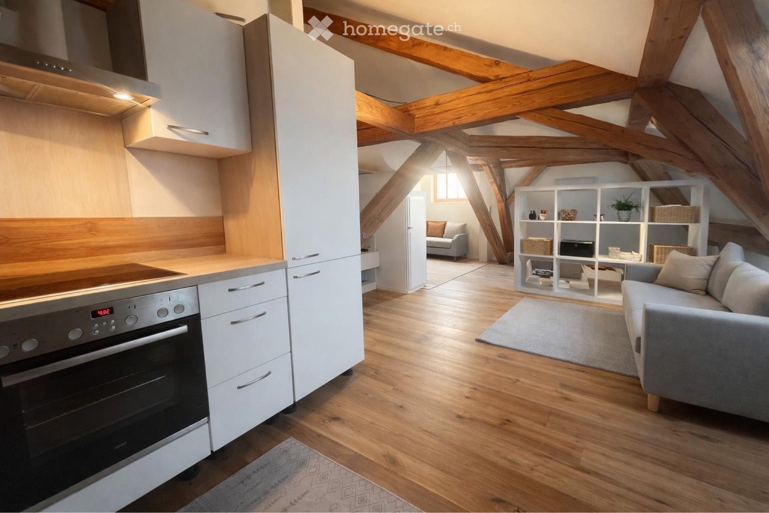 Der offene Wohn-, Ess- und Küchenbereich bietet viel Platz für individuelles Wohnen und Einrichten. Die moderne Küche fügt sich harmonisch in den Raum ein und lädt zum Kochen und Geniessen ein. Dank der zentralen Lage sind Einkaufsmöglichkeiten, öffentliche Verkehrsmittel sowie weitere Infrastrukturen bequem zu Fuss erreichbar.