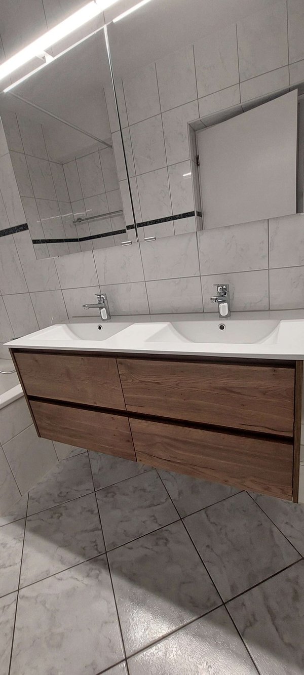 Hauptbad mit Doppelwaschbecken, WC, Waschmaschine und Tumbler.