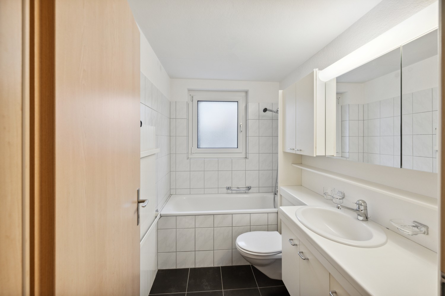 Badezimmer mit Plattenboden, Badewanne und Fenster