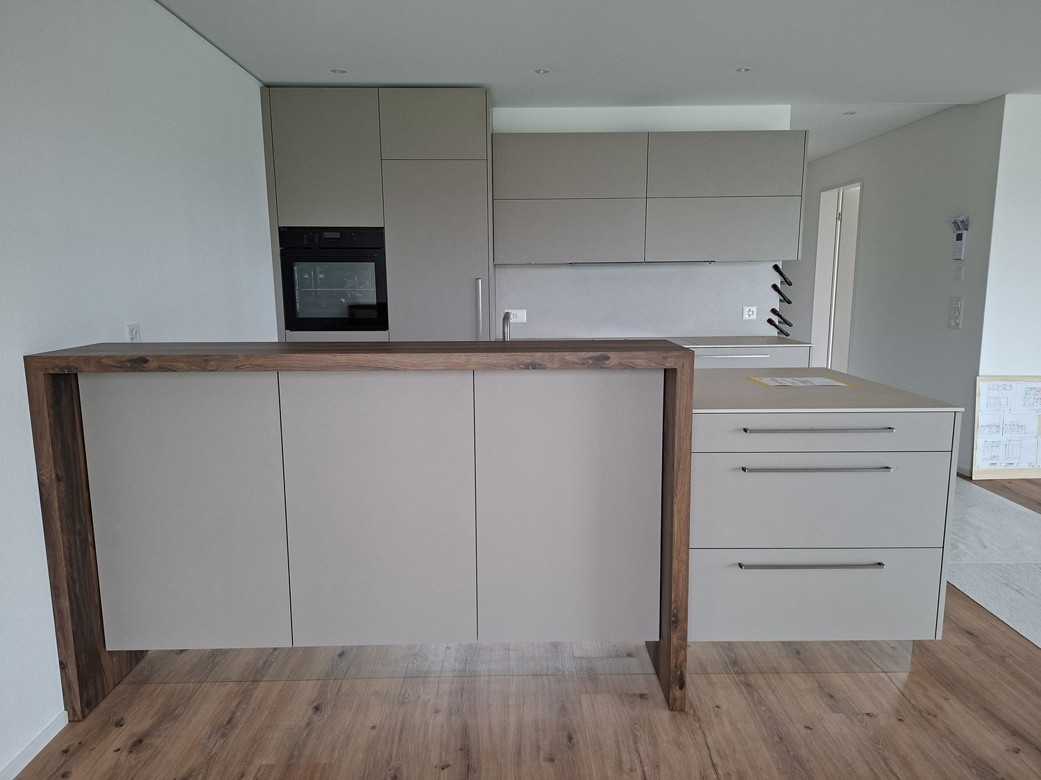 • Küche: Möblierung mit Keramikabdeckungen, Arbeitsinsel ca. 2.70m mit integrierter Bar, Backofen, Induktionskochfeld und einen Kühlschrank.