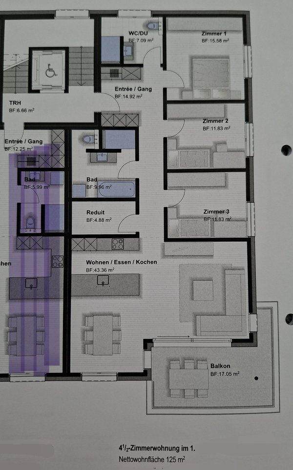 Diese grosse 4.5 Zimmer Etagenwohnung verfügt über 125.00m2 Nettowohnfläche plus Keller, ein überdeckter Balkon rund 20 m2.