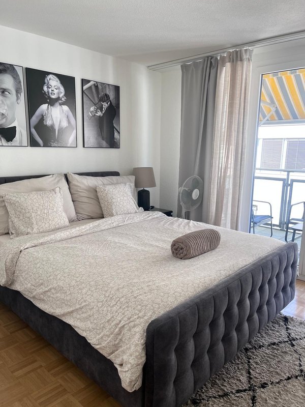 Die helle und grosszügige Wohnung verfügt über eine voll ausgestattete Küche, ein Badezimmer mit Badewanne sowie zwei Balkone, darunter ein ca. 20 m² grosser Balkon mit direktem Zugang vom Schlafzimmer. Das Schlafzimmer ist mit einem sehr bequemen Bett für eine Person, Einbauschrank und Kommode ausgestattet. Im möblierten Wohnzimmer stehen ein Projektor sowie ein Schlafsofa für eine zusätzliche Person zur Verfügung.