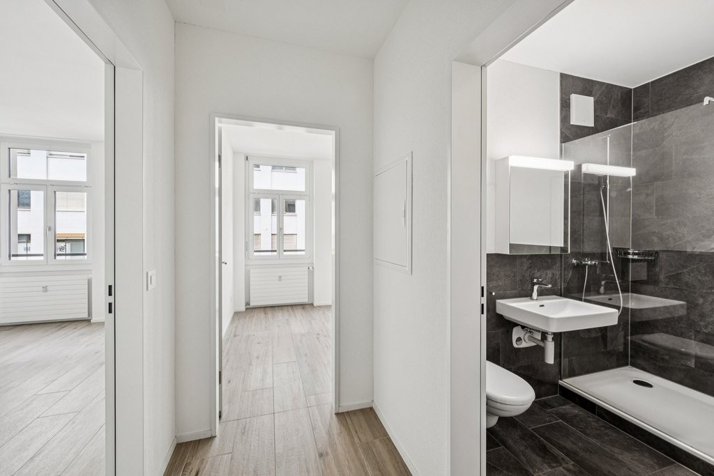 Die Wohnung überzeugt durch einen offenen Wohn- und Essbereich mit moderner Küche, zwei helle Zimmer mit grossen Fenstern sowie ein hochwertiges Badezimmer mit Dusche . Der pflegeleichte Boden in Holzoptik sorgt für ein warmes und modernes Wohngefühl.
