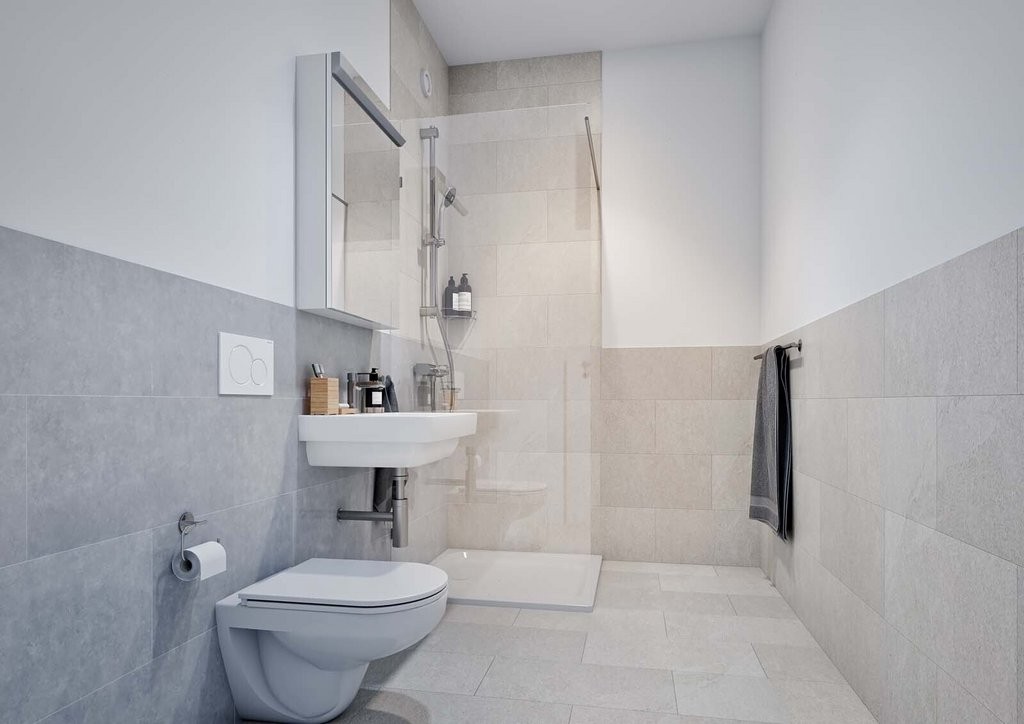 - Badezimmer mit pflegeleichtem hellem Plattenboden