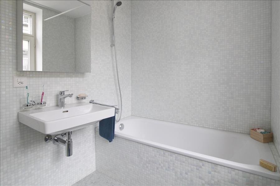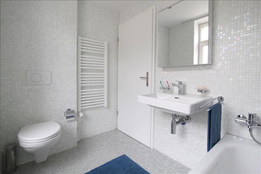 - Bad/WC mit hellen Mosaikplatten und Handtuchradiator