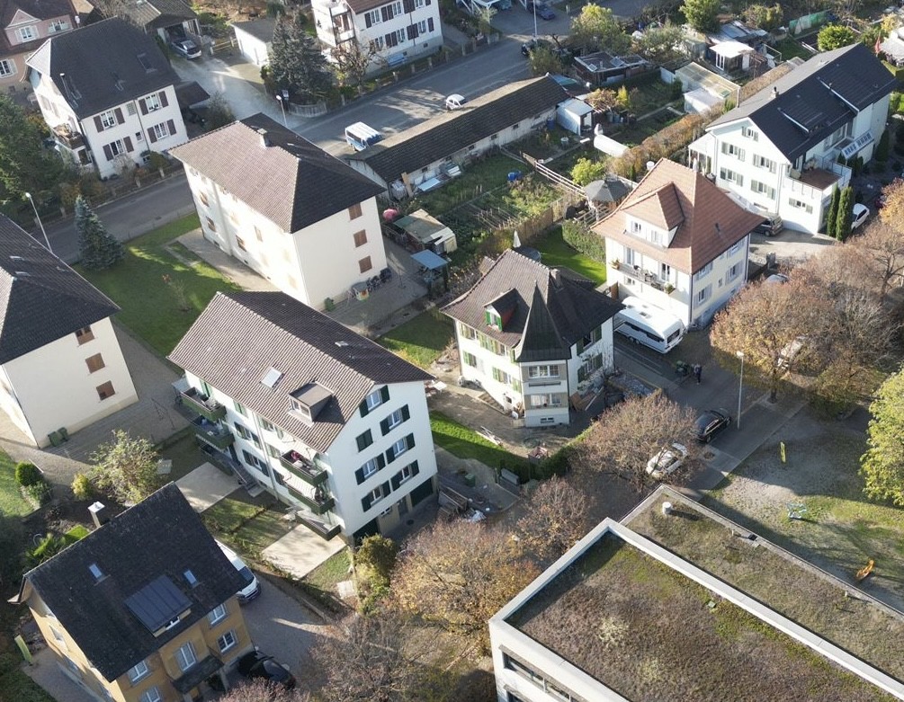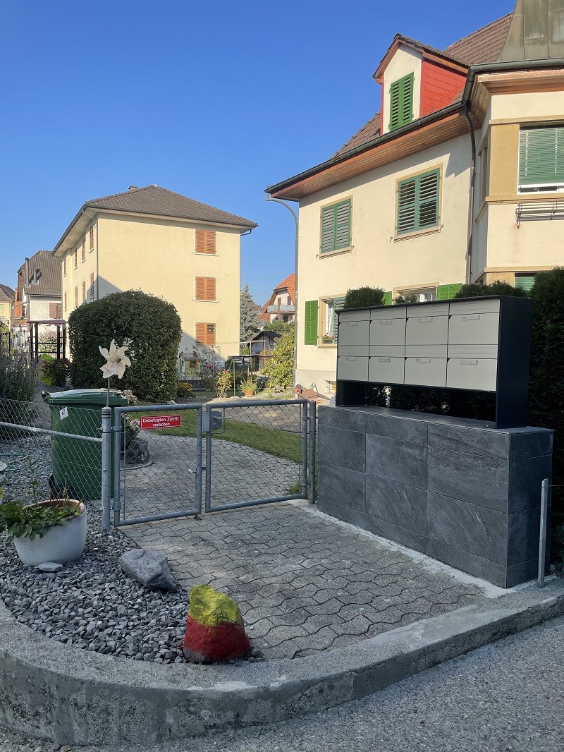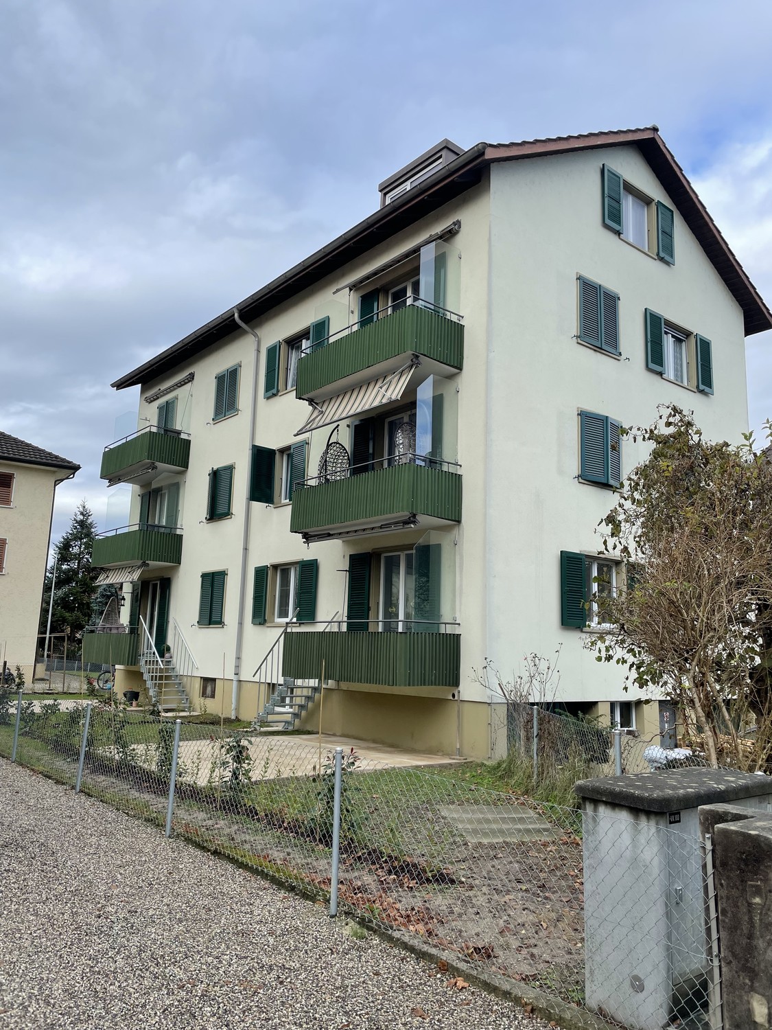Das grosszügige Wohngebäude mit braunem Dach und grünen Fenstern fügt sich harmonisch in die gepflegte Nachbarschaft ein und verfügt über einen kleinen Garten sowie praktische Infrastruktur wie Briefkästen und Abfallentsorgung.