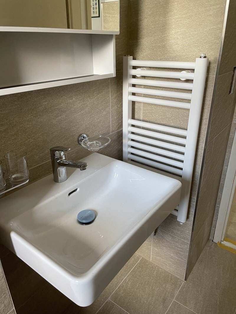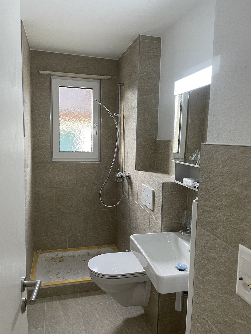 Modernes Badezimmer: Komplett ausgestattet mit zeitgemässer Dusche, WC, weissem Waschbecken und Spiegel