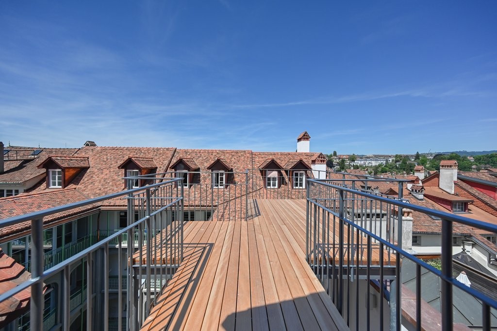 Sonnige Terrasse mit Blick auf das Berner Münster und den Rosengarten