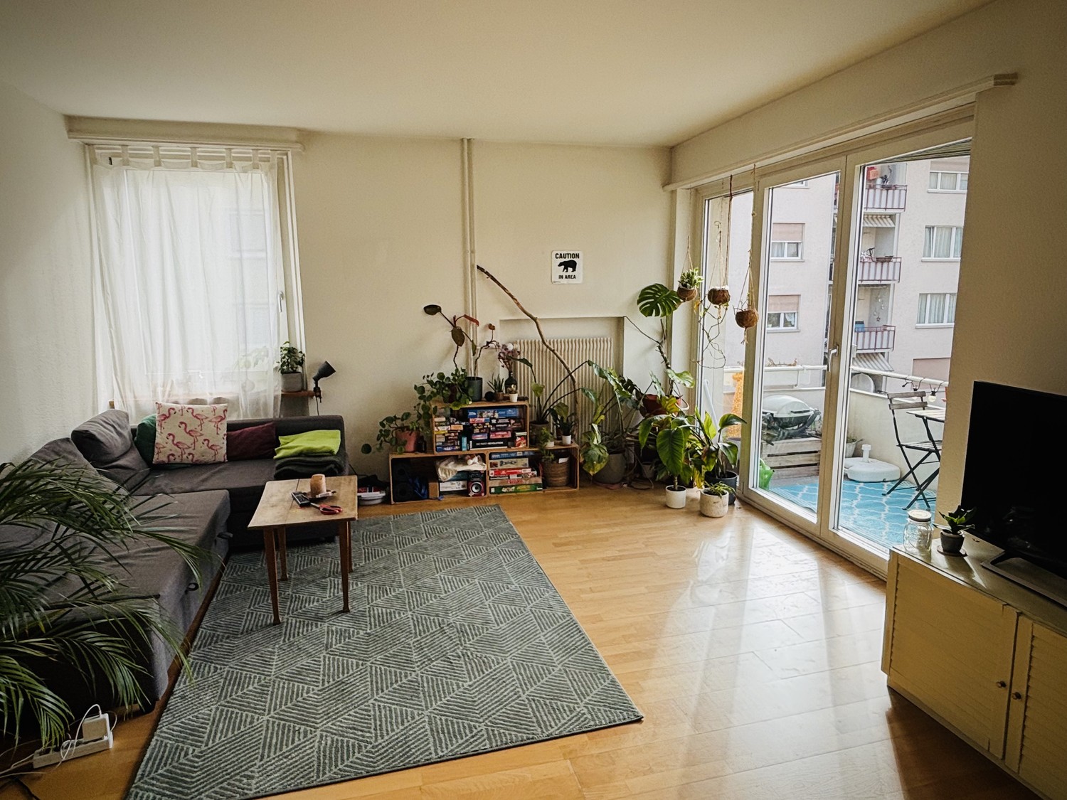 Zur Wohnung gehören eine gemütliche Stube, eine gut ausgestattete Küche sowie ein kleiner Balkon für frische Luft und entspannte Sommerabende. Das Badezimmer teilen wir uns zu dritt. Es gibt eine Waschküche, die flexibel genutzt werden kann. Ein Kellerabteil steht zur gemeinsamen Nutzung zur Verfügung.