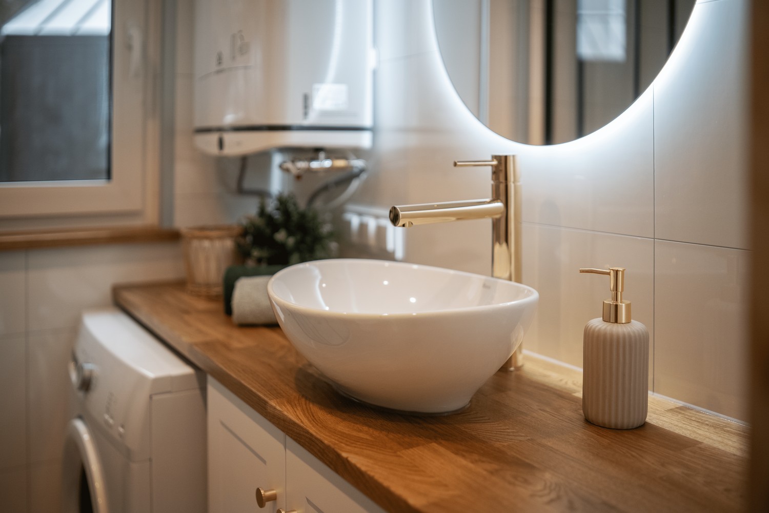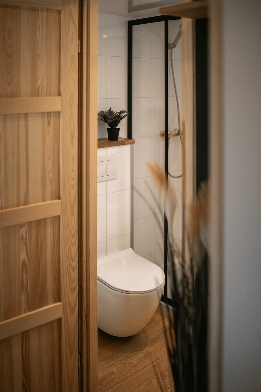 Badezimmer mit vollverglaster Eckdusche, WC, Waschbecken & Wärmepumpenboiler