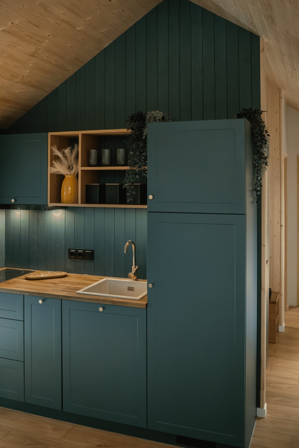 Moderne Küche mit Induktionsherd, Backofen, Kühlschrank & Hängeschränken