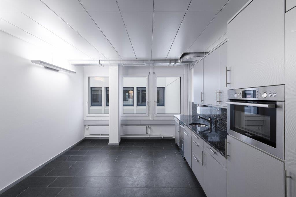 - Teppichboden im Büroraum und Plattenboden in der Küche