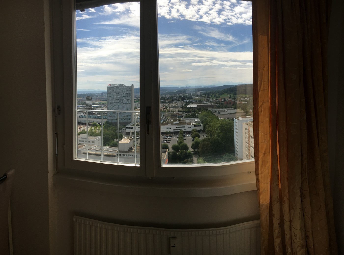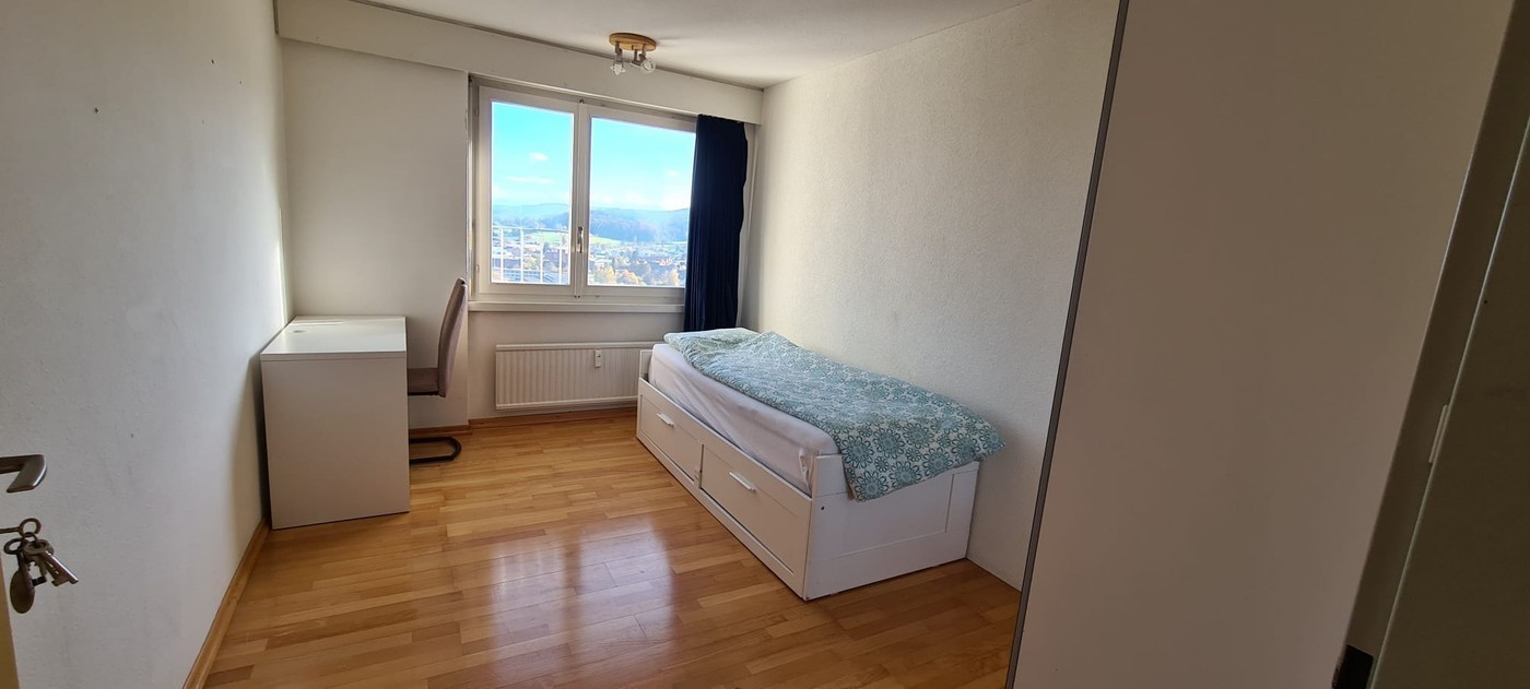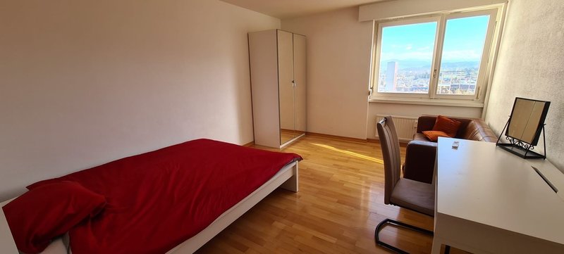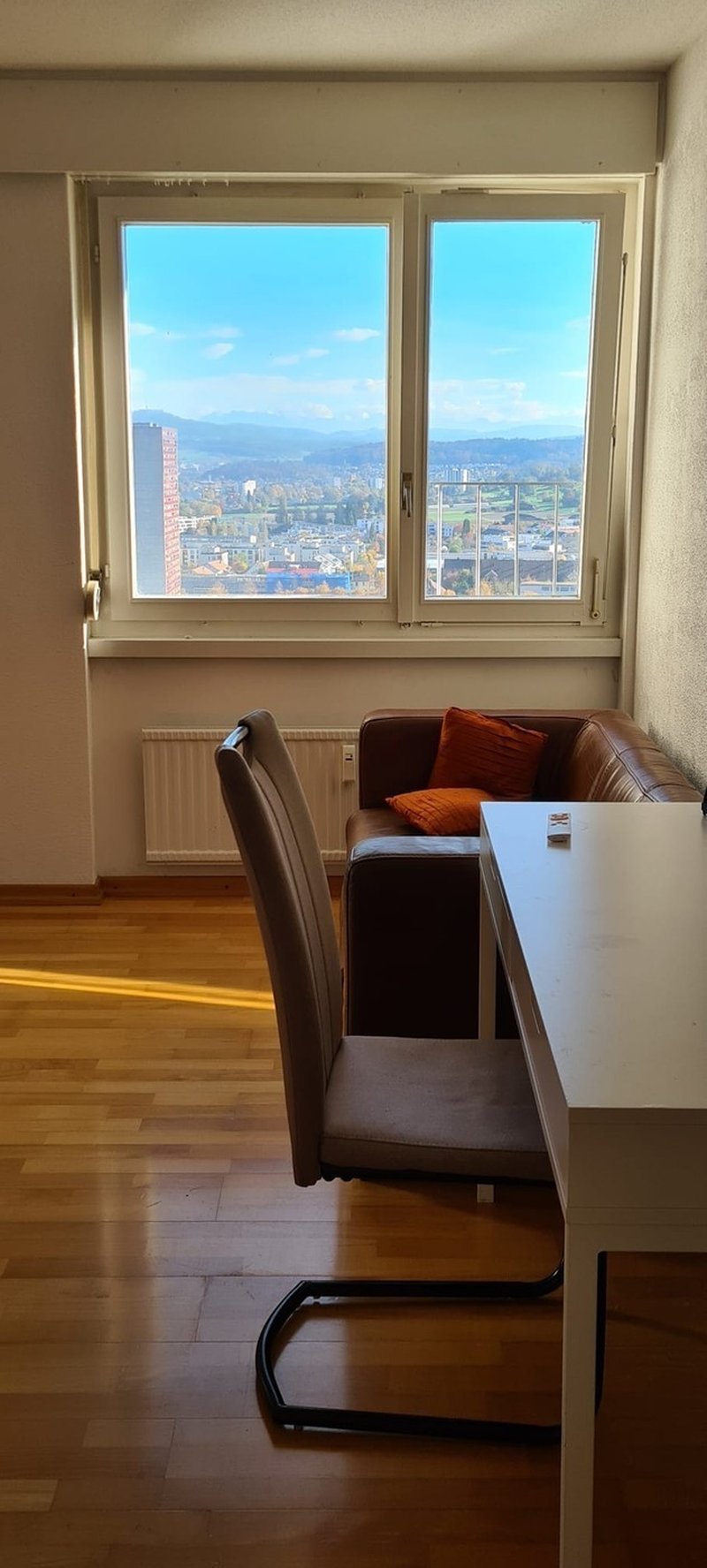 The apartment has a nice view and is on the 22nd Floor. Price for the rooms are from 650-1000 CHF There are four rooms in the apartment. All rooms are given to four different people. The apartment is close to the bus stop and not far from the shopping centre. There is a bus to Killwangen Spreitenbach from near the apartment.
