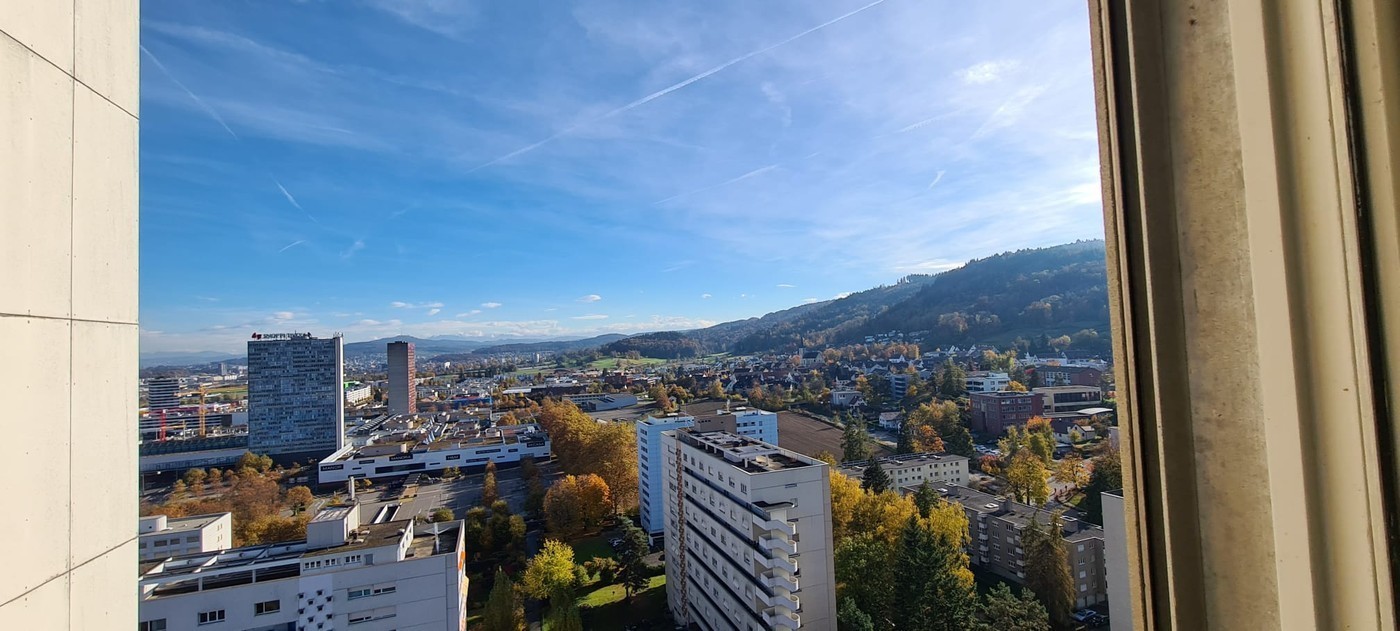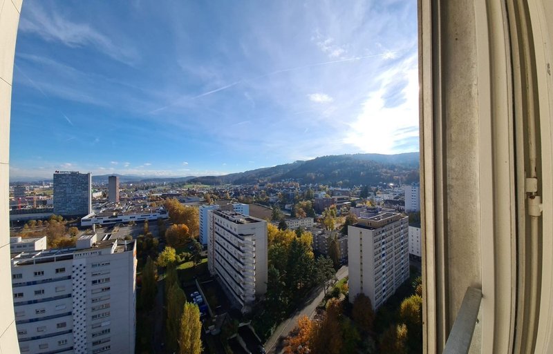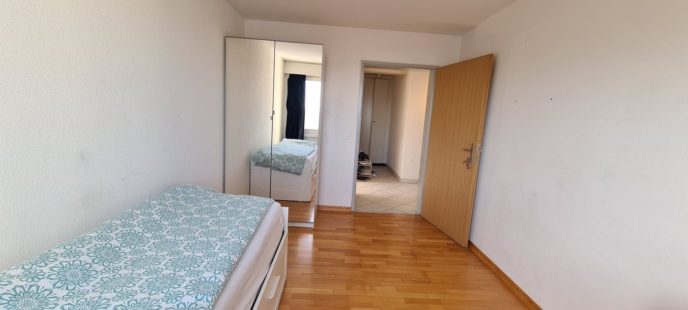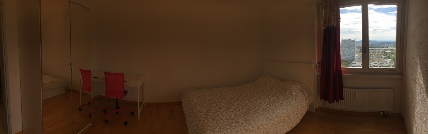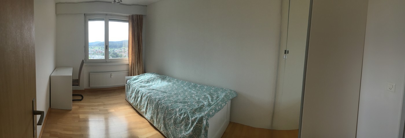 The apartment has a nice view and is on the 22nd Floor. Price for the rooms are from 650-1000 CHF There are four rooms in the apartment. All rooms are given to four different people. The apartment is close to the bus stop and not far from the shopping centre. There is a bus to Killwangen Spreitenbach from near the apartment.