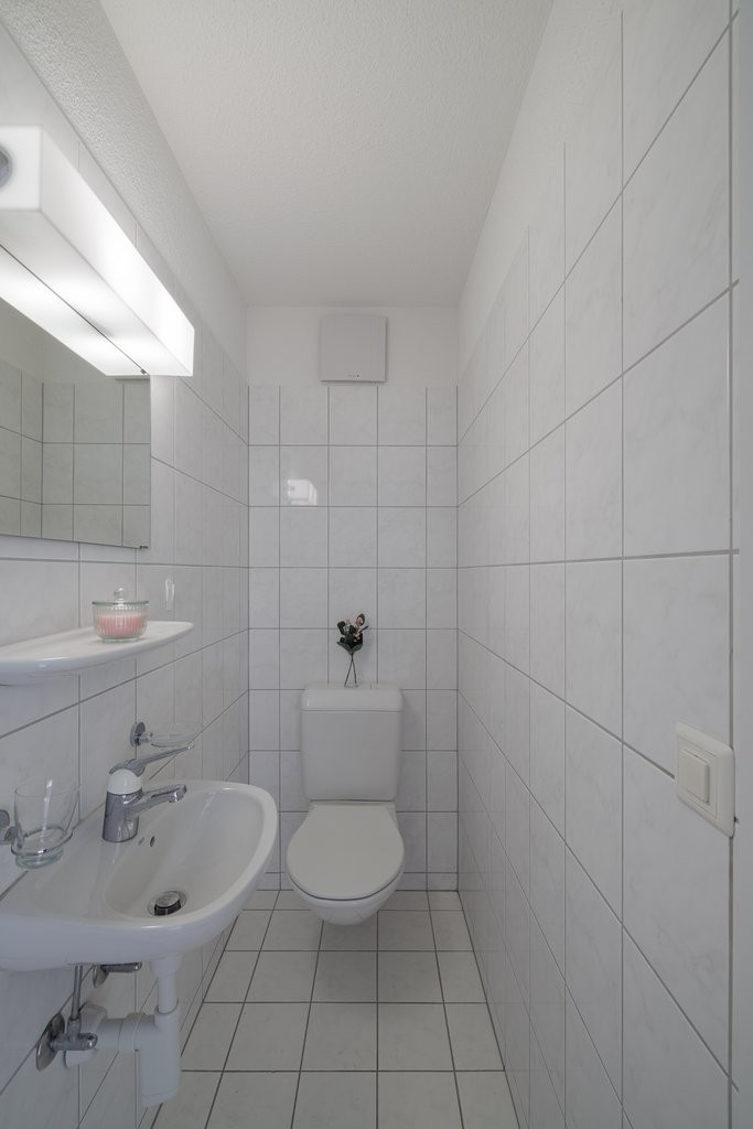 - Badezimmer mit WC, Lavabo, Spiegelschrank und Badewanne