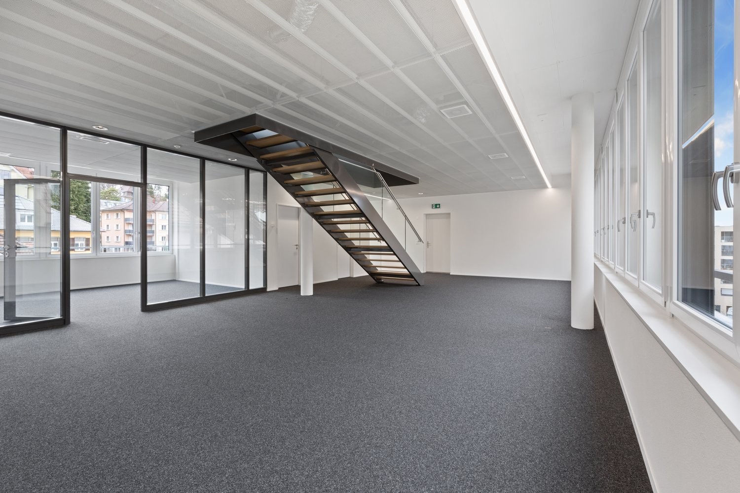 Die interne Treppenverbindung verbindet die Ebenen elegant und sorgt für kurze Wege zwischen den Abteilungen – ein Pluspunkt für effiziente Zusammenarbeit und ein dynamisches Arbeitsumfeld.