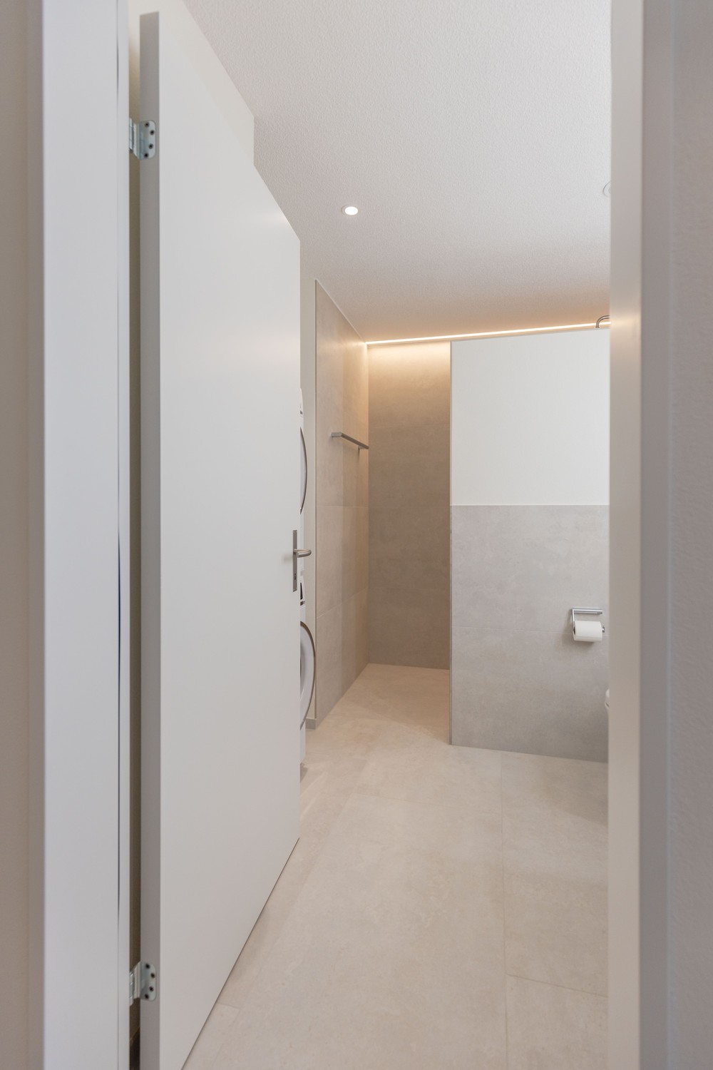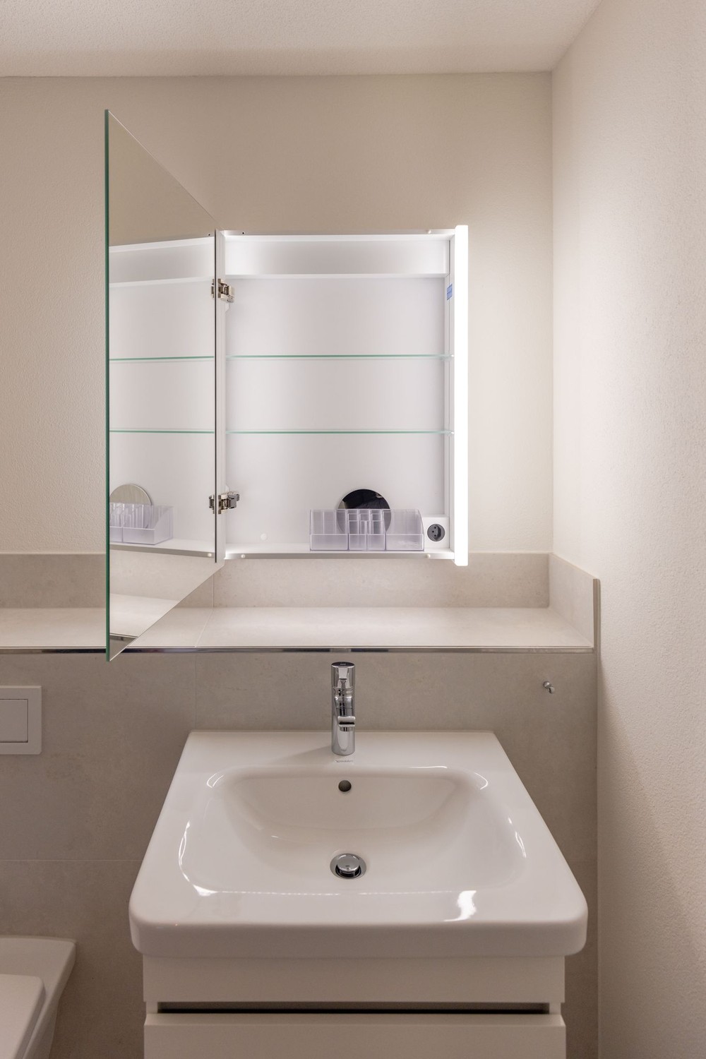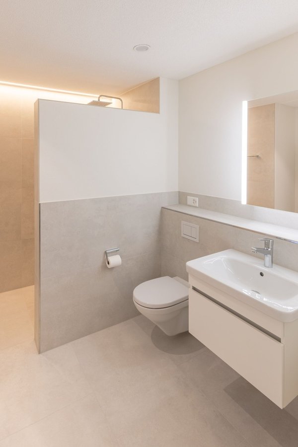 • Einladendes Badezimmer mit grossflächigen 60 cm x 120 cm Keramikplatten, Waschtisch, Waschtischunterbau und dimmbaren LED-Lichtkonzept
