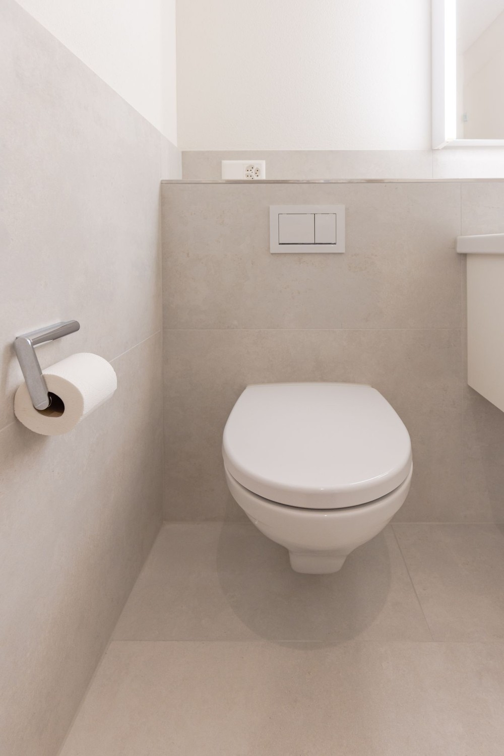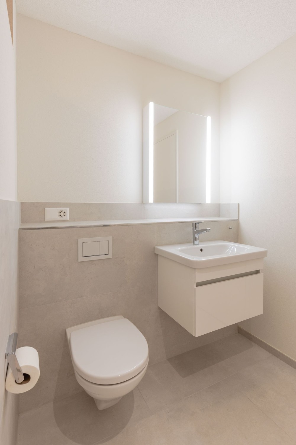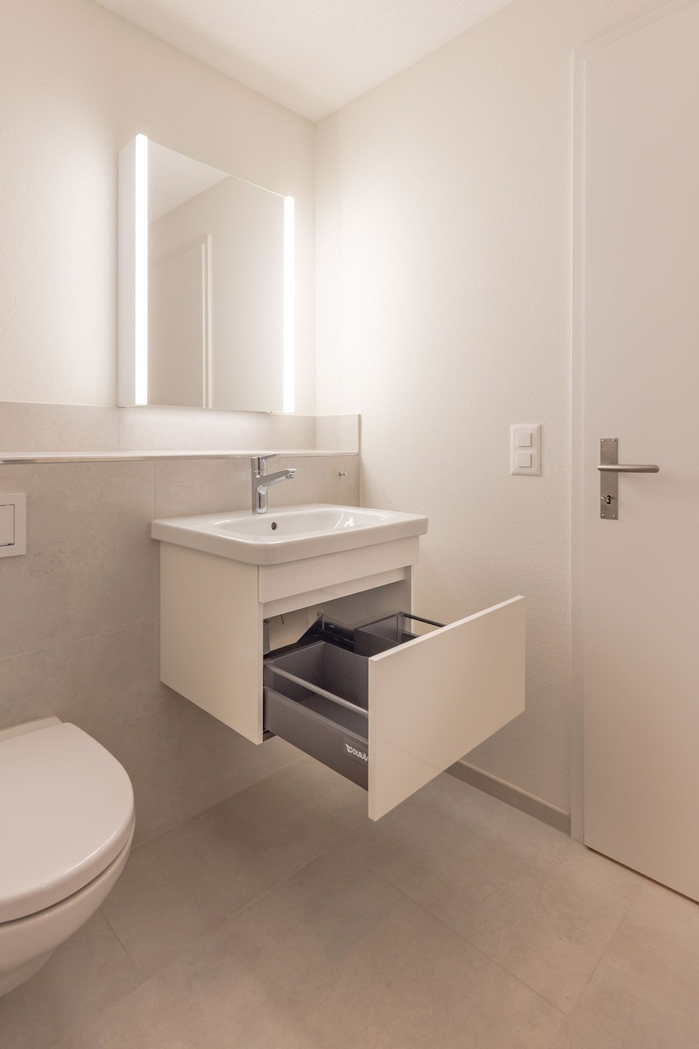 • Einladendes Badezimmer mit grossflächigen 60 cm x 120 cm Keramikplatten, Waschtisch, Waschtischunterbau und dimmbaren LED-Lichtkonzept