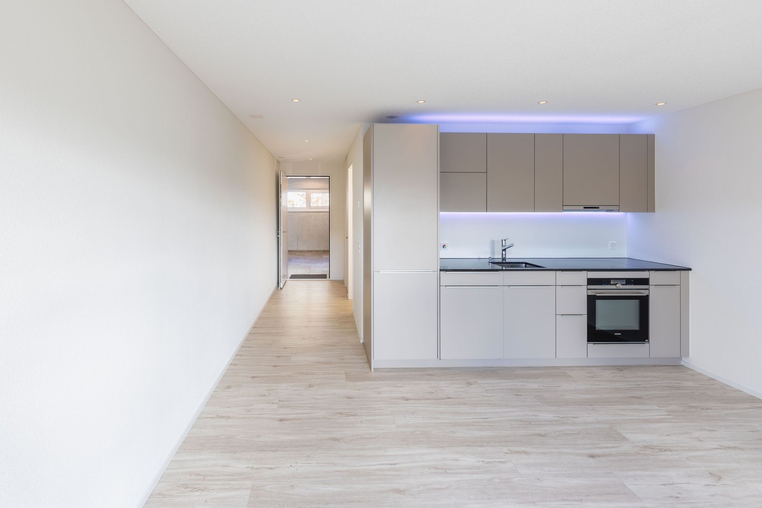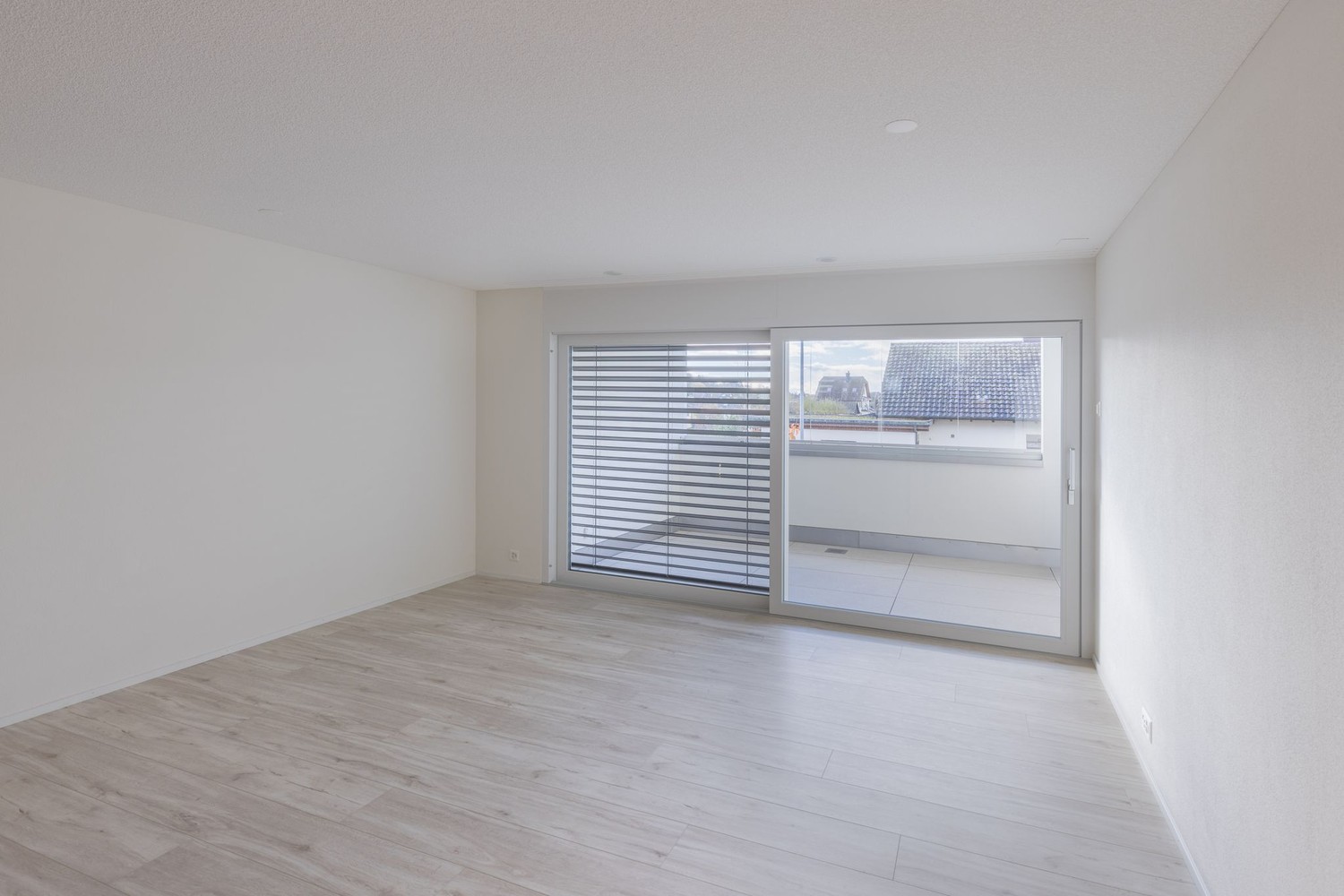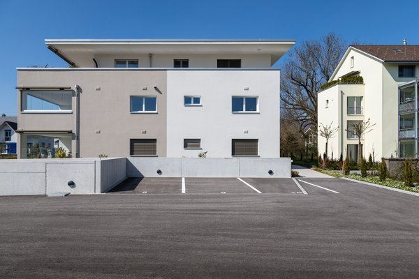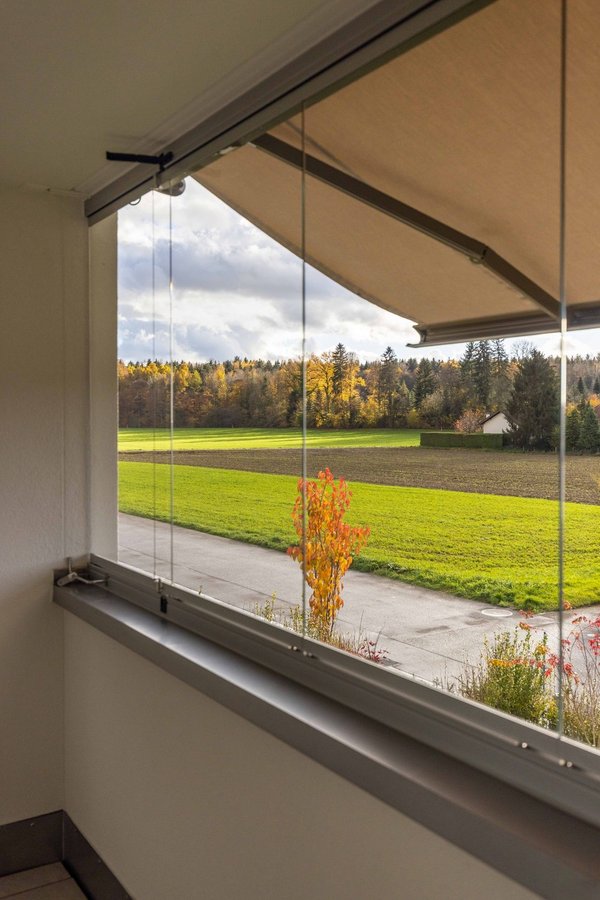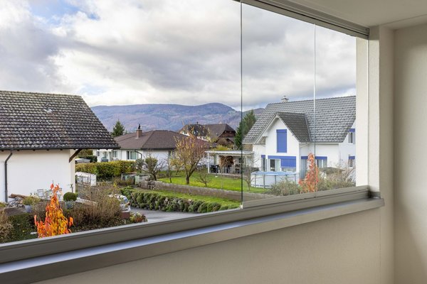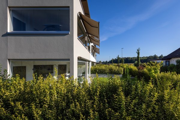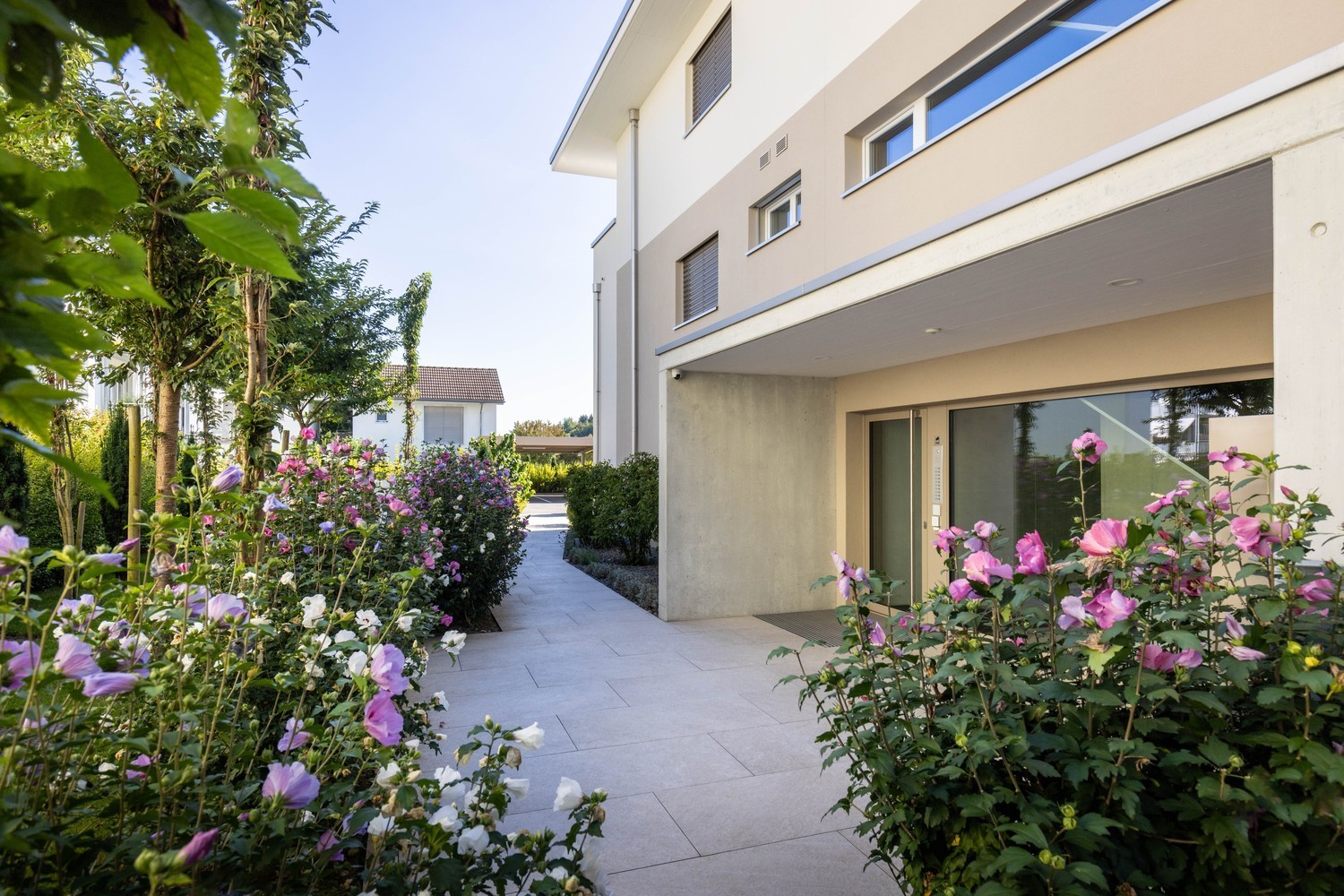 Ruhig gelegene, hochwertige, helle und moderne 1.5 Zimmer Terrassenwohnung im Obergeschoss mit 9 m² Wintergarten mit Weitsicht gegen Westen (Abendsonne), 1 Parkplatz inkl. und Gemeinschaftsgartengarten mit rundum Sichtschutz