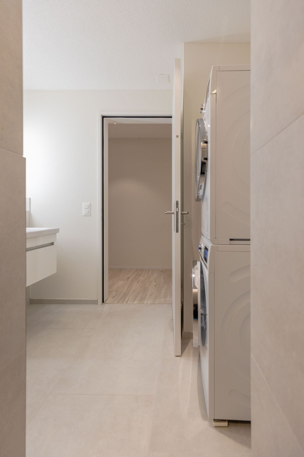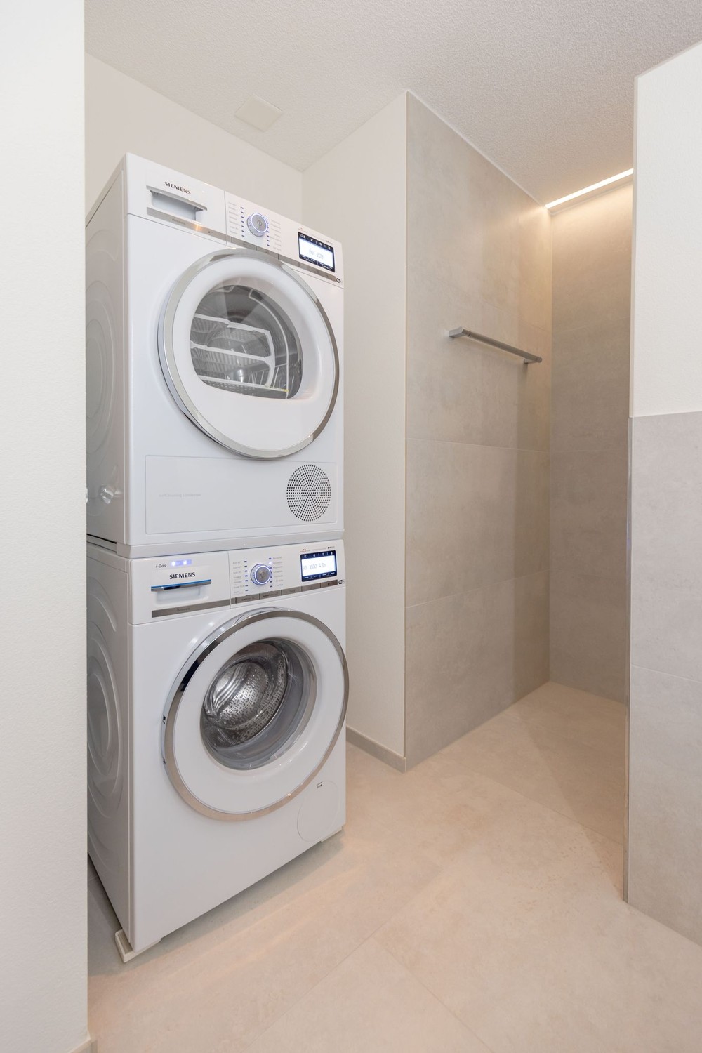 • Moderne Waschmaschine und Tumbler im Badezimmer beide über Tablet/Mobile bedienbar
