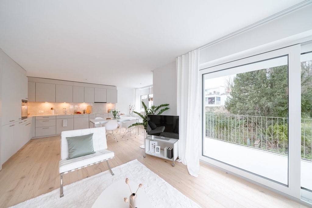 Geniessen Sie exklusive Wohlfühlmomente auf Ihrem eigenen Balkon, der nicht nur einen weiten Blick, sondern auch die Abendsonne bietet.