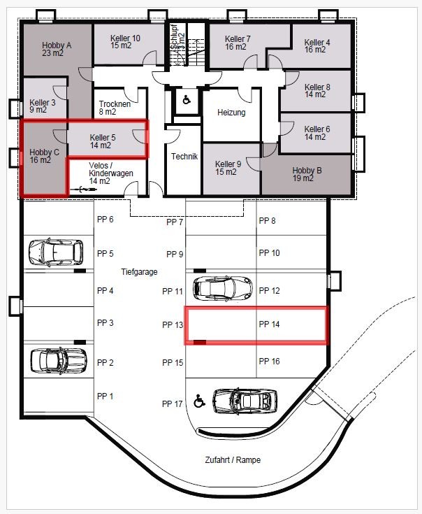 Kellerraum (14 m²) sowie separater Hobbyraum (16 m²)