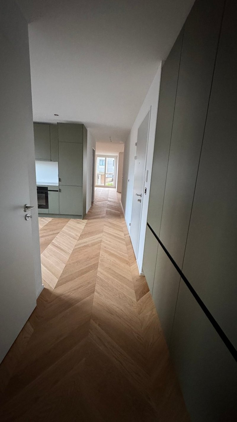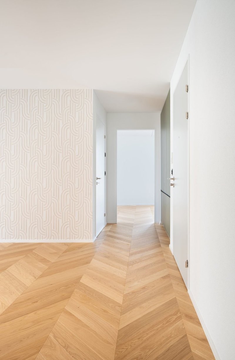 Hochwertiger Bodenbelag: Elegantes Fischgrät-Eichenparkett in heller Ausführung verleiht der Wohnung eine moderne und stilvolle Note. Bad und Gartensitzplätze sowie Loggias und Balkone in hochwertigen Bodenplatten