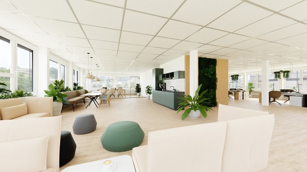 Hinweis: Bei den Fotos handelt es sich um die vergleichbare Fläche im 3.OG. Die Visualisierungen zeigen einen möglichen Ausbau.