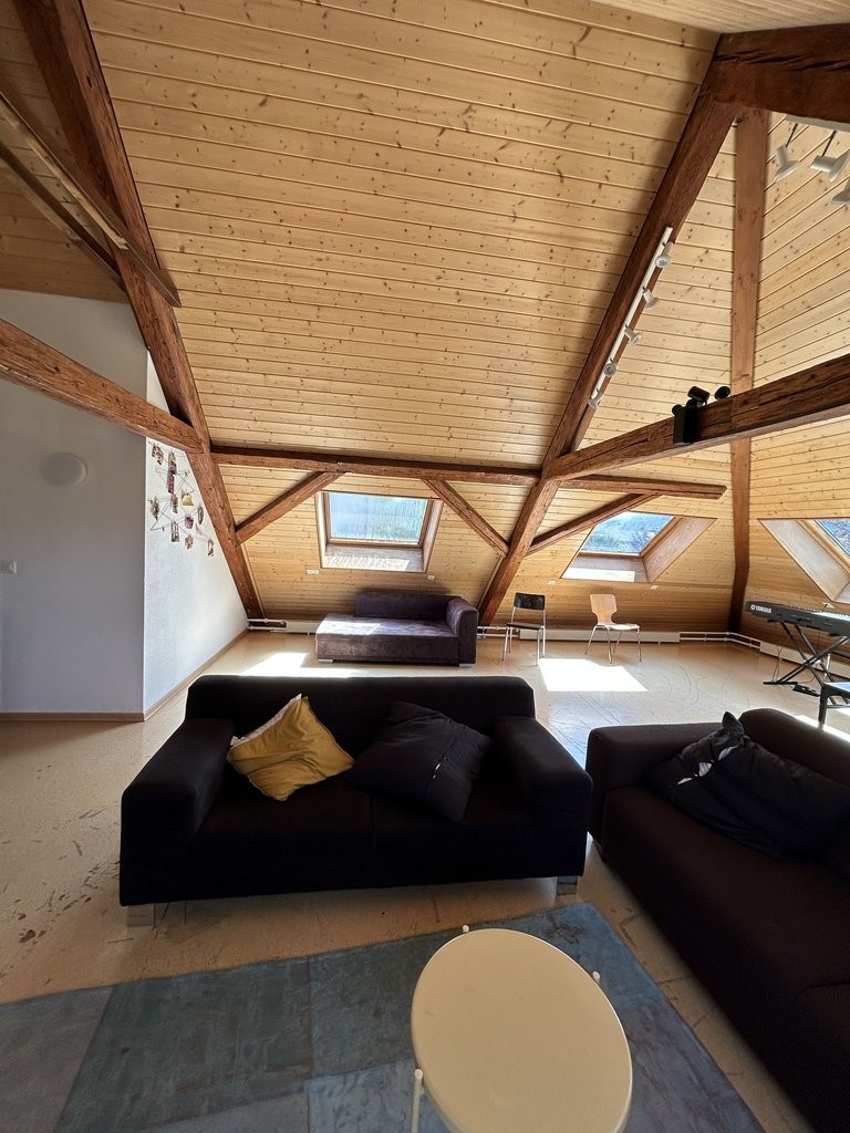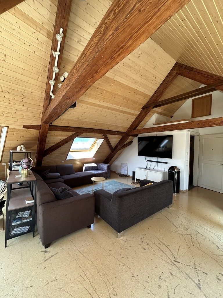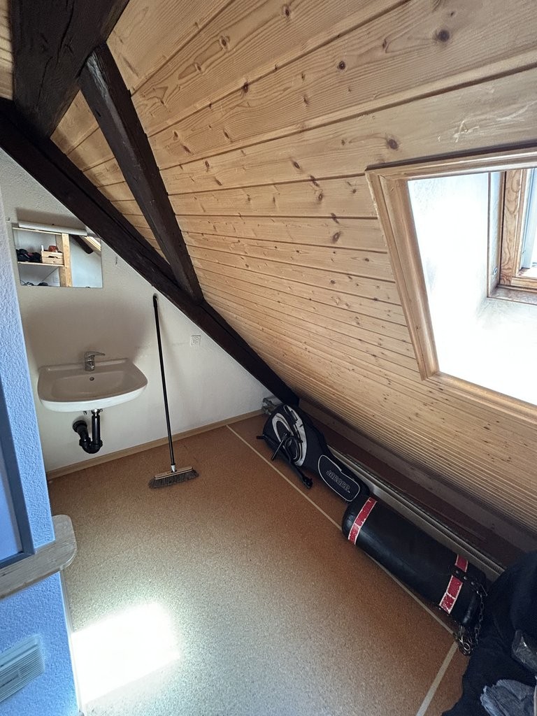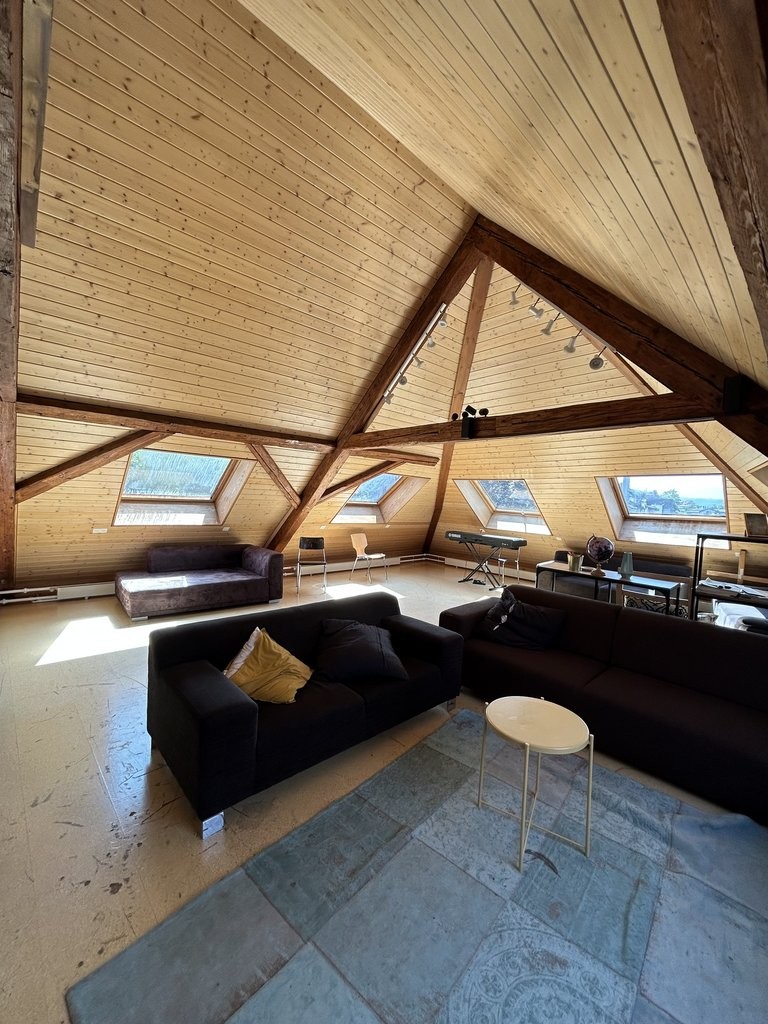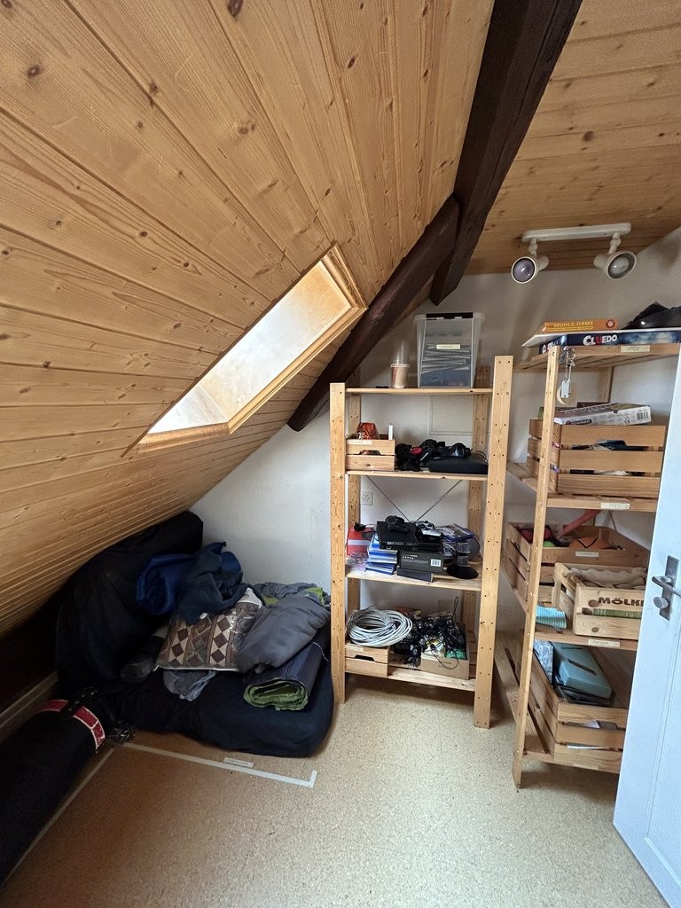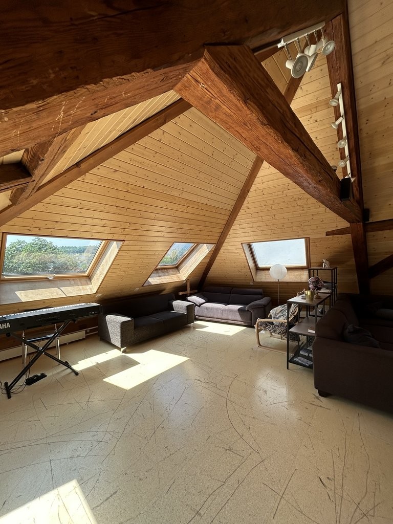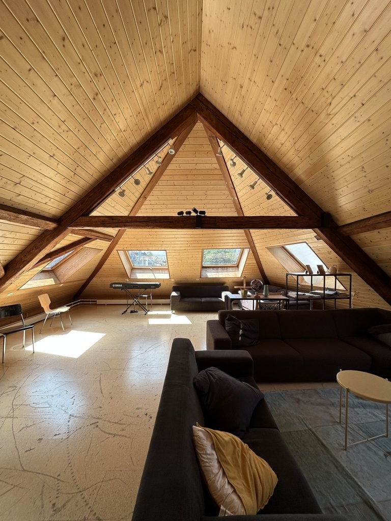 Der Raum besticht durch seine gemütliche Atmosphäre mit den Dachschrägen, der hellen Holzverkleidung und grossen Dachfenstern, die für viel natürliches Licht sorgen - ideal für kreative oder ruhige Tätigkeiten.