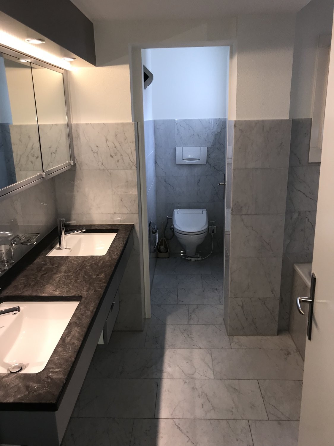 Badezimmer mit Doppellavabo, Badewanne und Dusche
