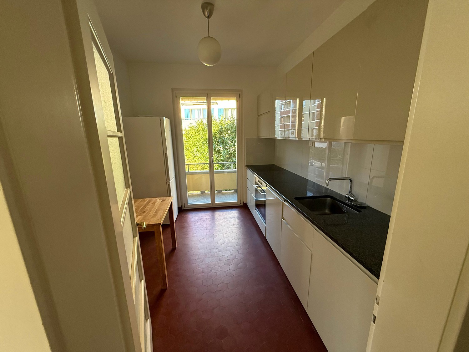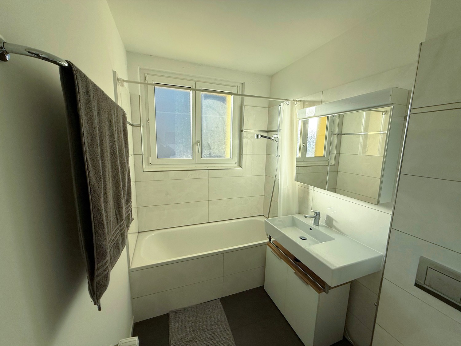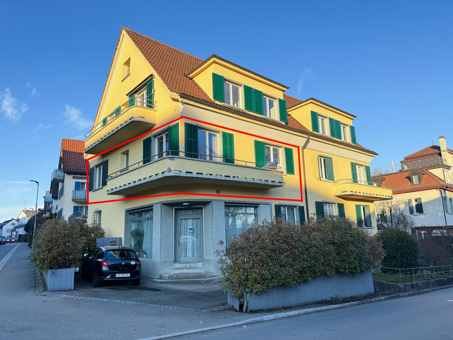 Close to Coop (large, 2 floors), Migros (large, 2 floors), Denner, Aldi