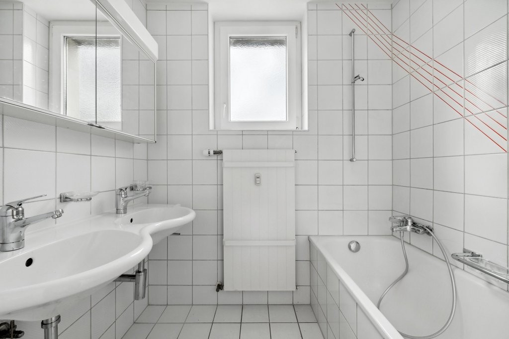 - Badezimmer mit Doppellavabo, Badewanne und Fenster, keramische Bodenplatten