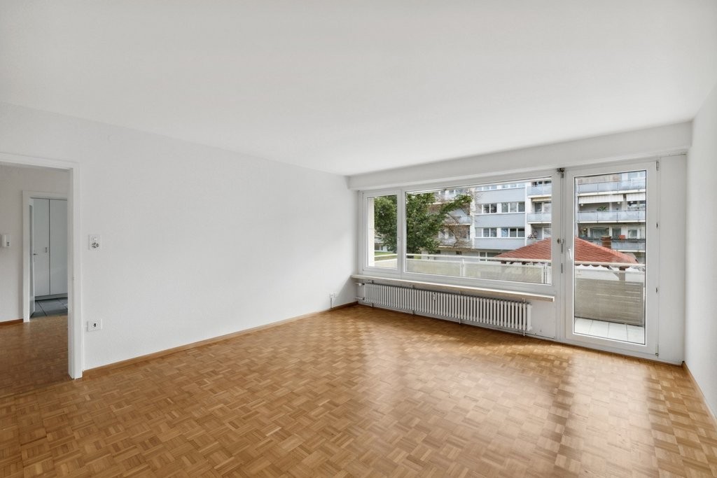 - Wohnzimmer mit einem praktischen Einbauschrank sowie Zugang zum Balkon, Parkettboden