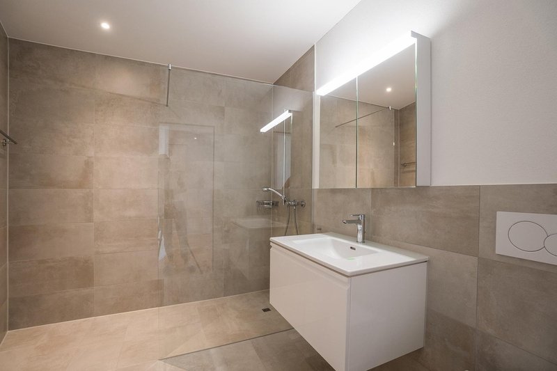 Nassraum mit pflegeleichtem Plattenboden, Lavabo mit Unterbaumöbel, Spiegelschrank, WC, Dusche/Badewanne und Glastrennwand