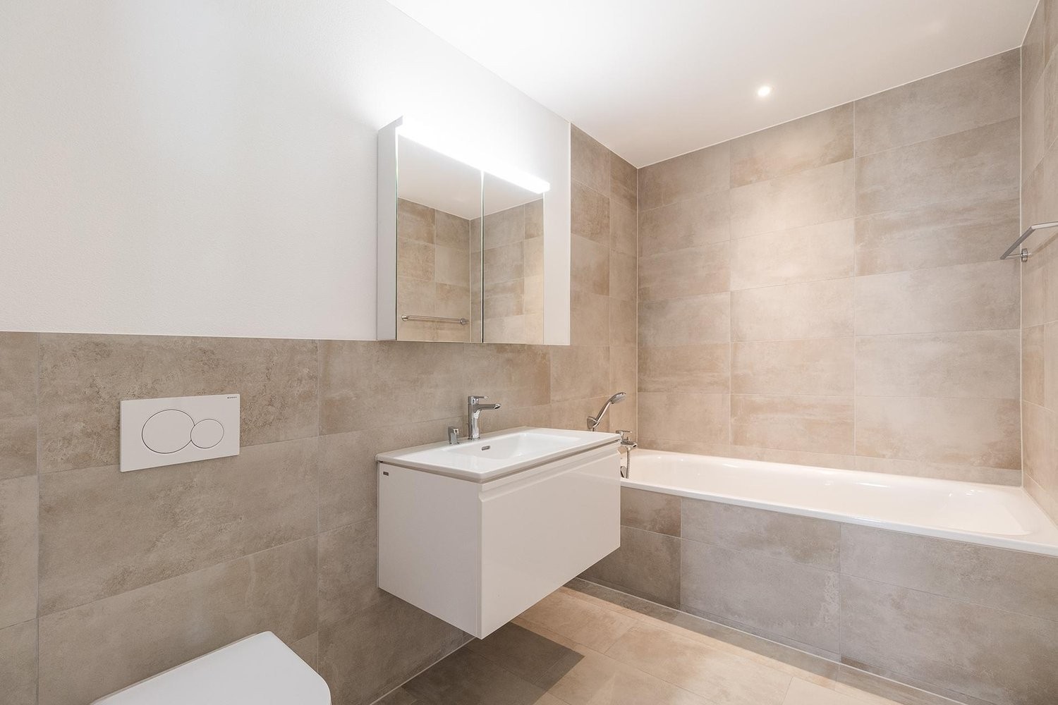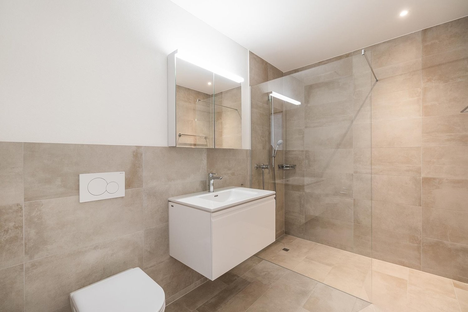 • Nassraum mit pflegeleichtem Plattenboden, Lavabo mit Unterbaumöbel, Spiegelschrank, WC, Dusche/Badewanne und Glastrennwand