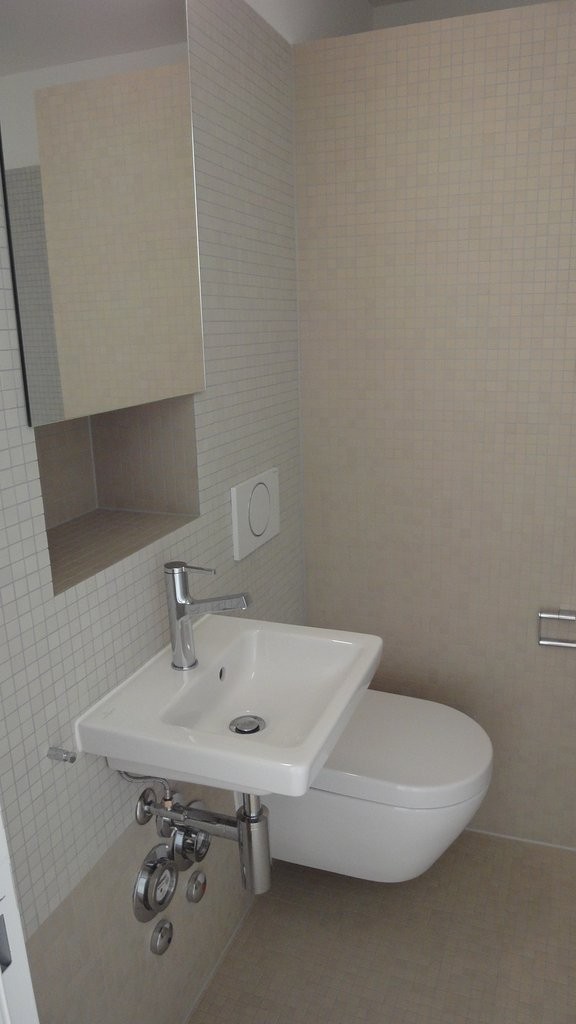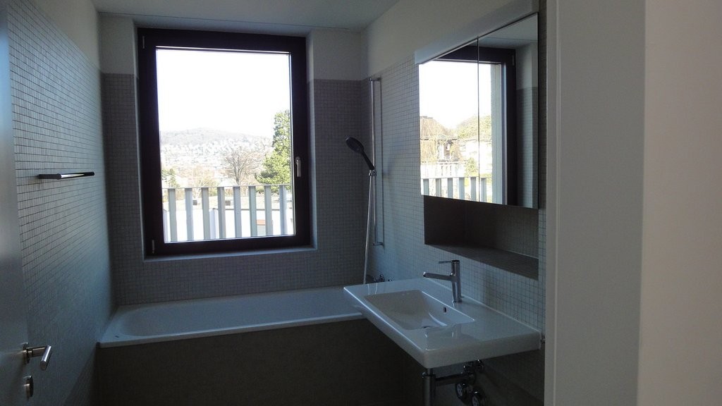2 Nasszellen (Bad/WC, Dusche/WC): - Hochwertige keramische Bodenplatten - Helle Mosaikplättli an den Wänden - Grosse Wandspiegel - Fenster, elektrische Lamellenstoren