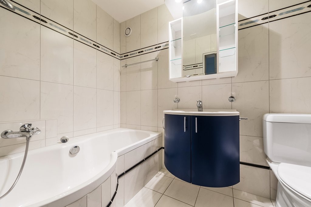 - Badezimmer mit WC, Lavabo, Spiegelschrank und Badewanne