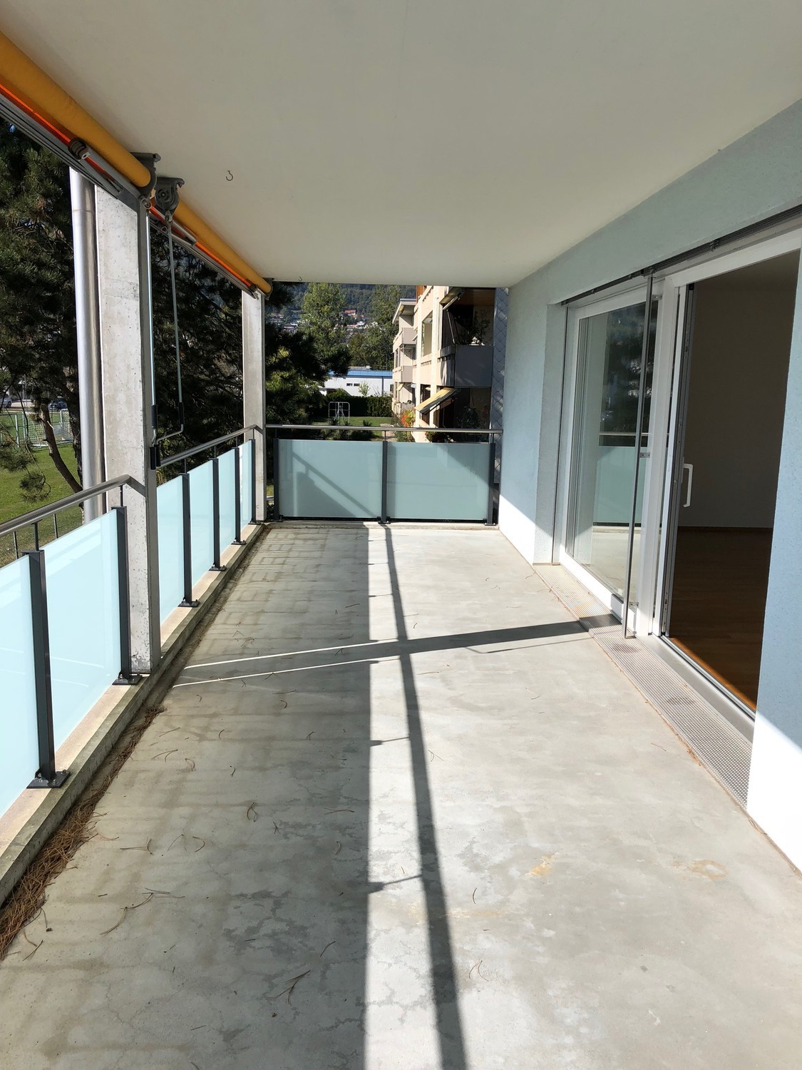 Sonniger Balkon mit Licht, Steckdosen und zwei grossen Sonnenstoren – ideal zum Entspannen