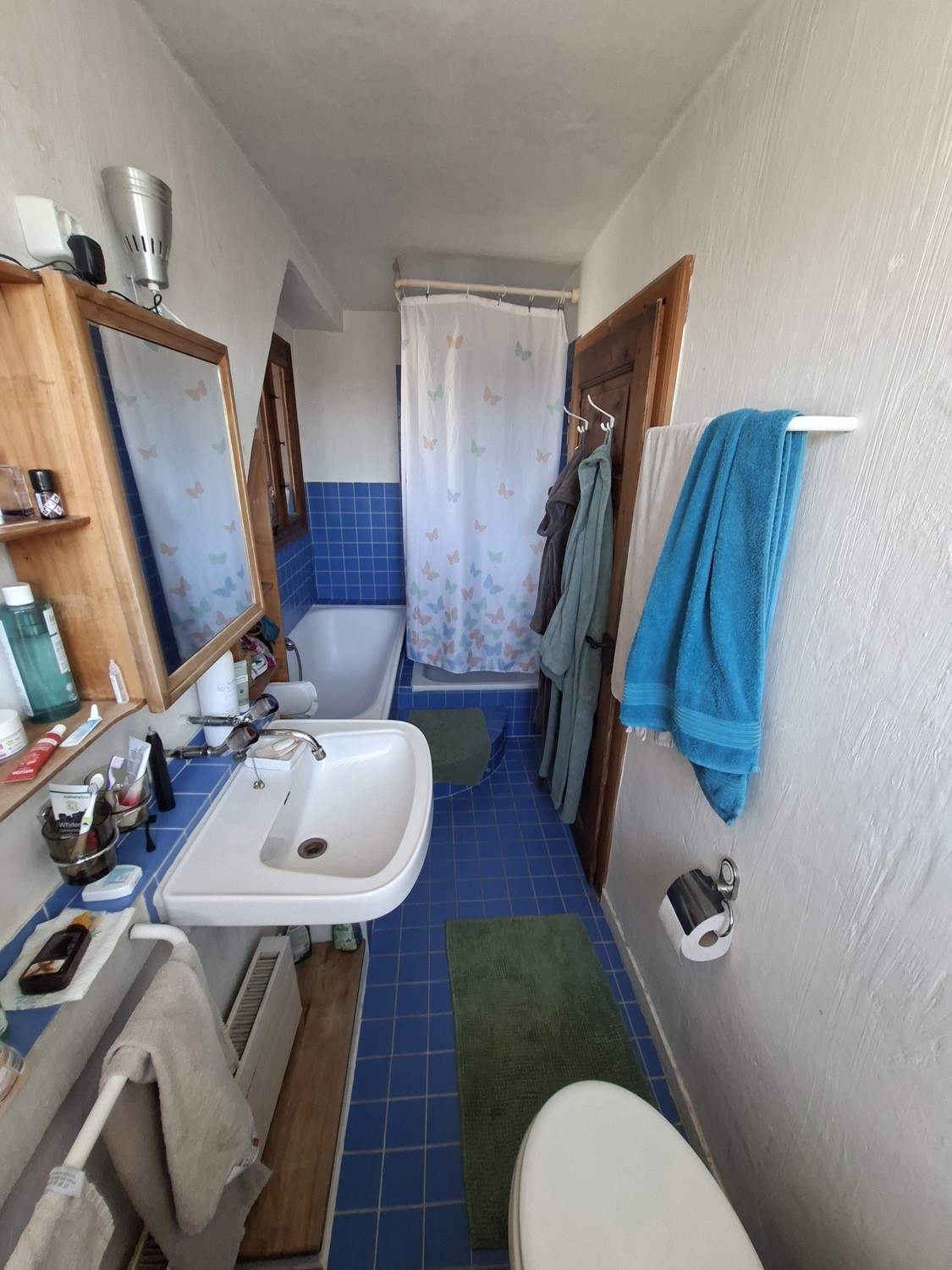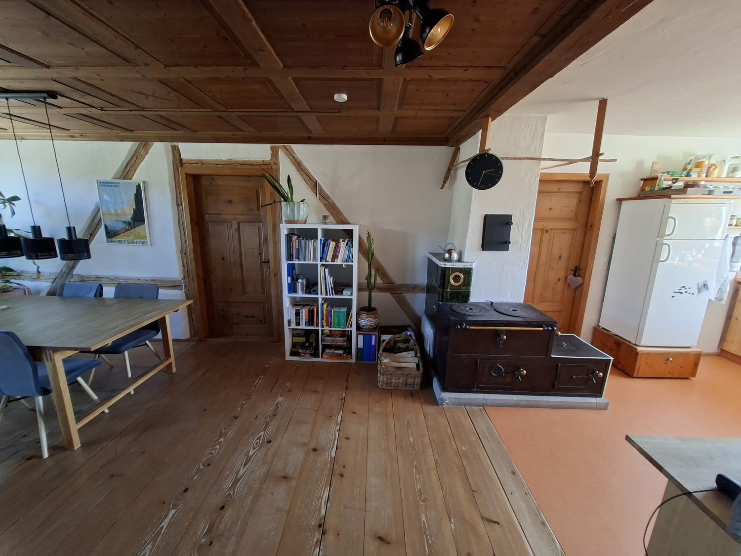 Ausserdem hat es einen Kachelofen, der mit Holz/Holzbriketts eingefeuert werden kann und der Wohnung im Winter zusätzlichen Charme verleiht.